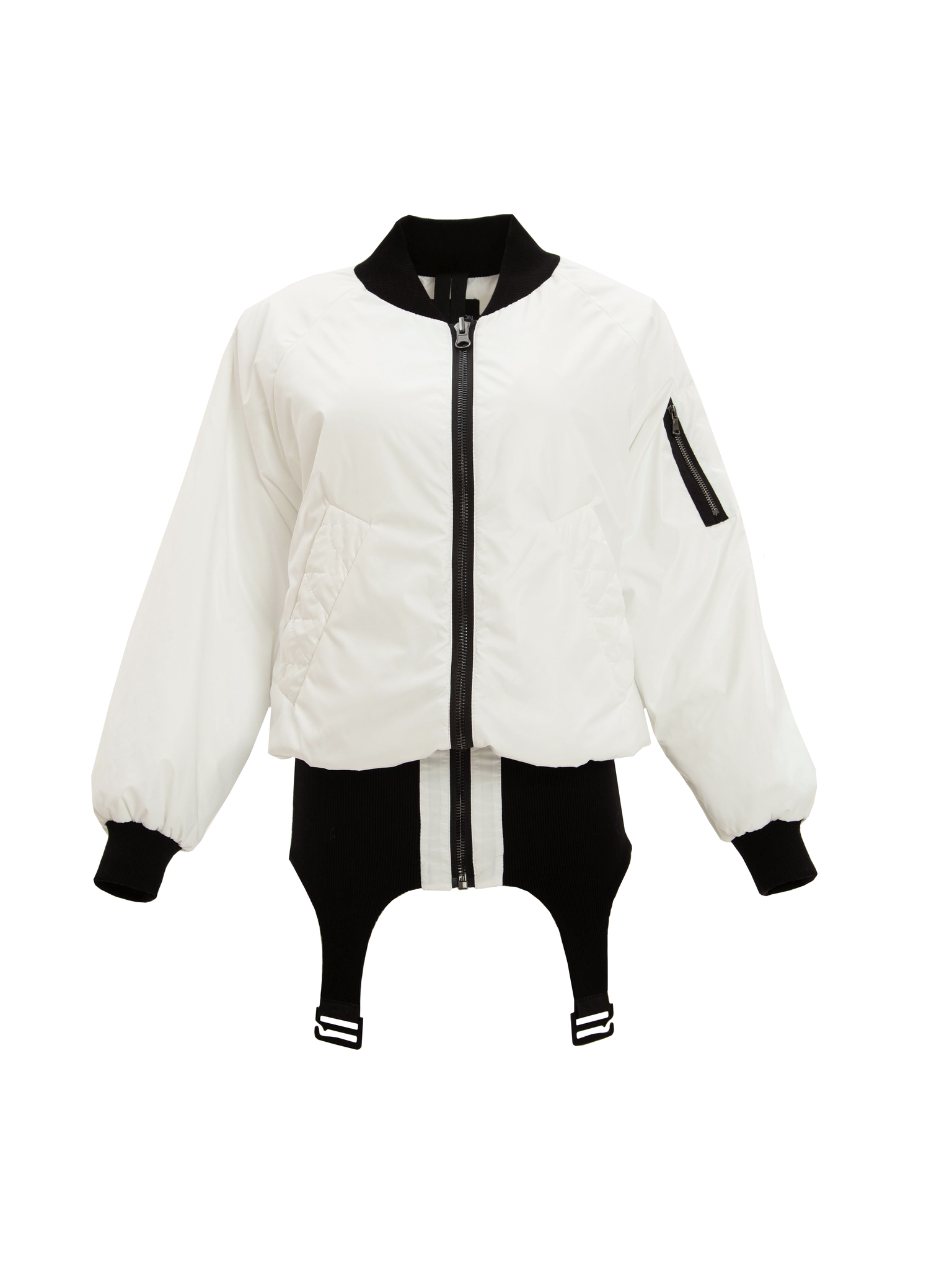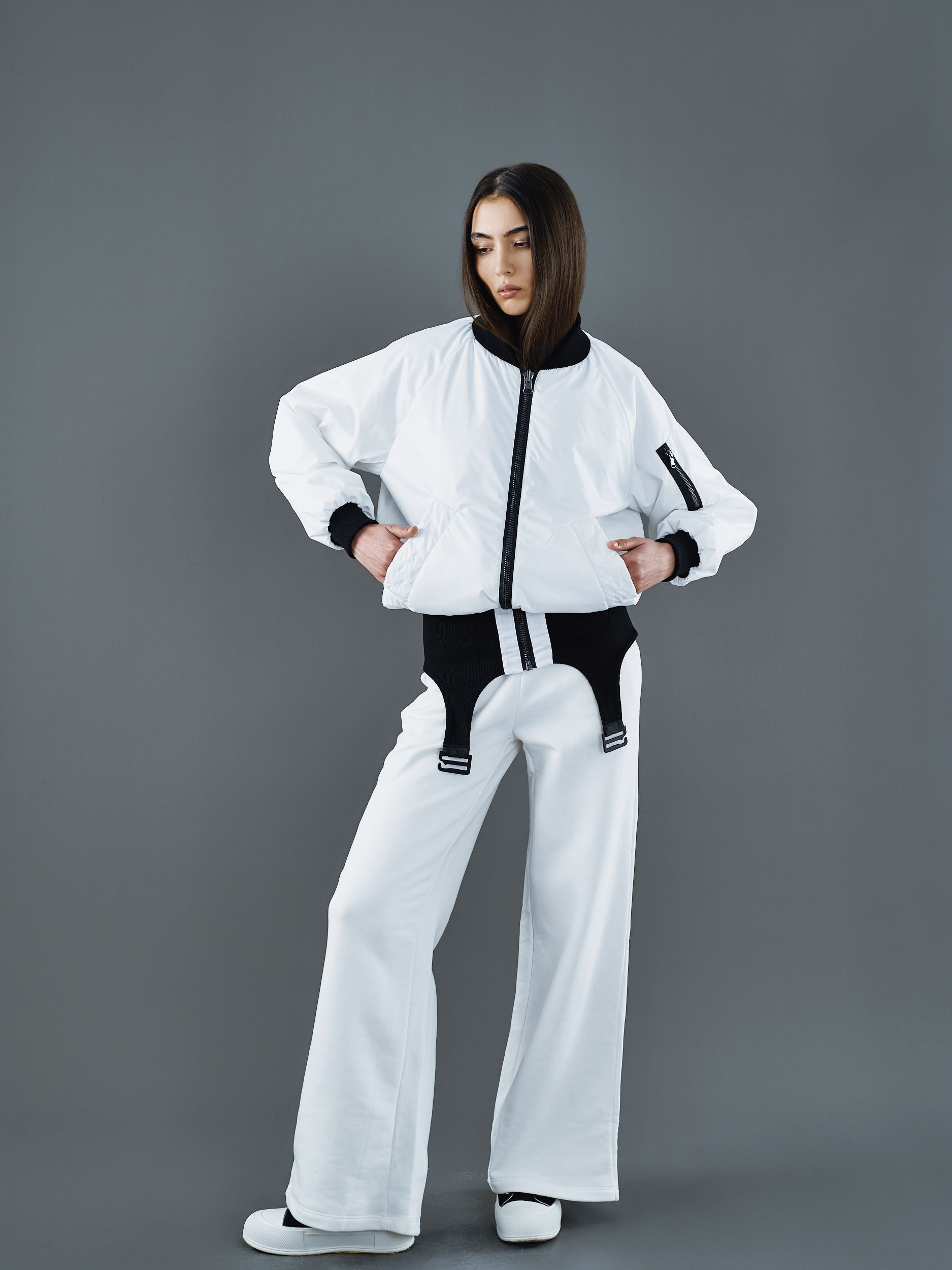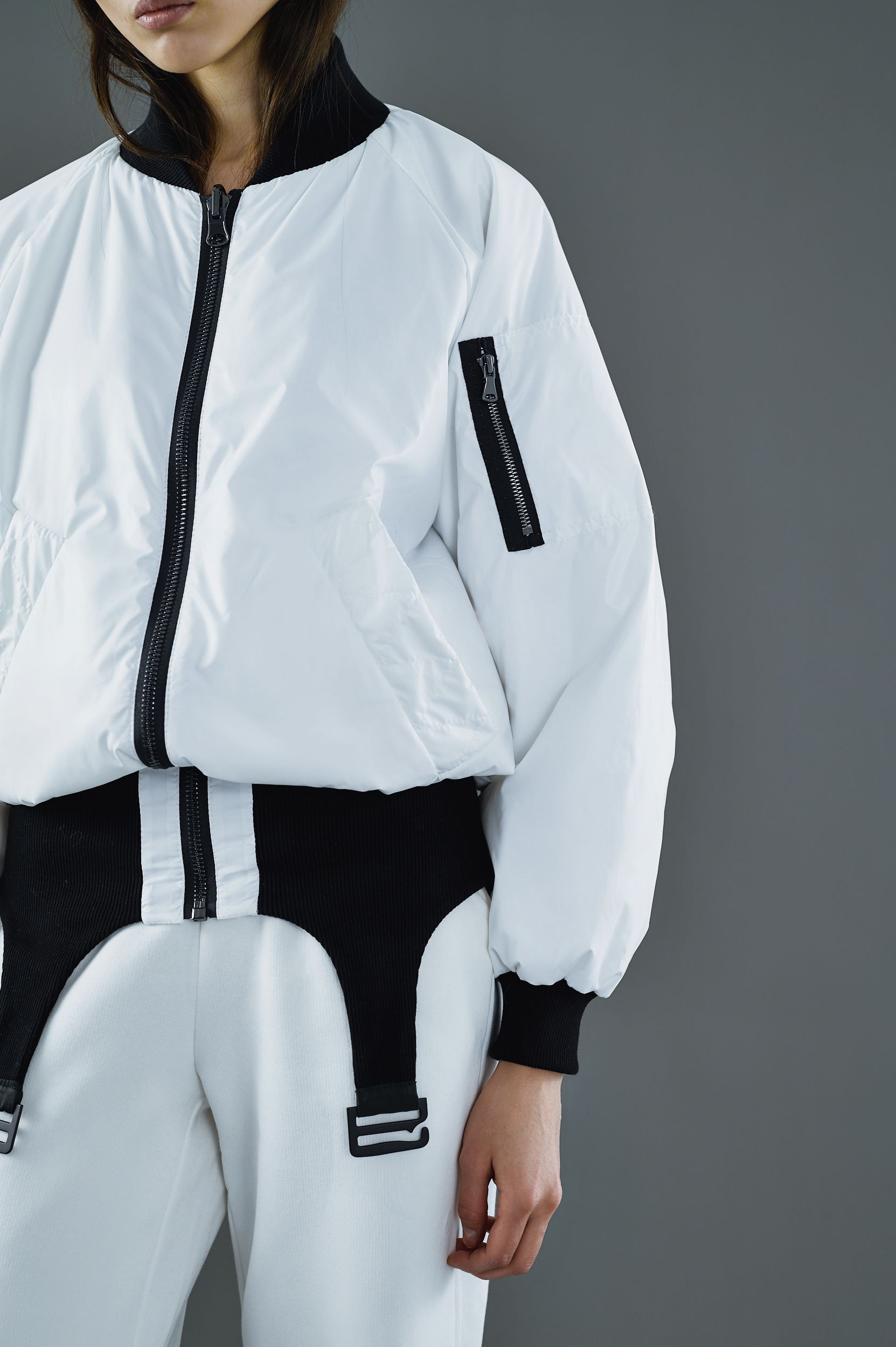 Белый бомбер-трансформер с эластичными низом, стилизованным под пояс для чулков.