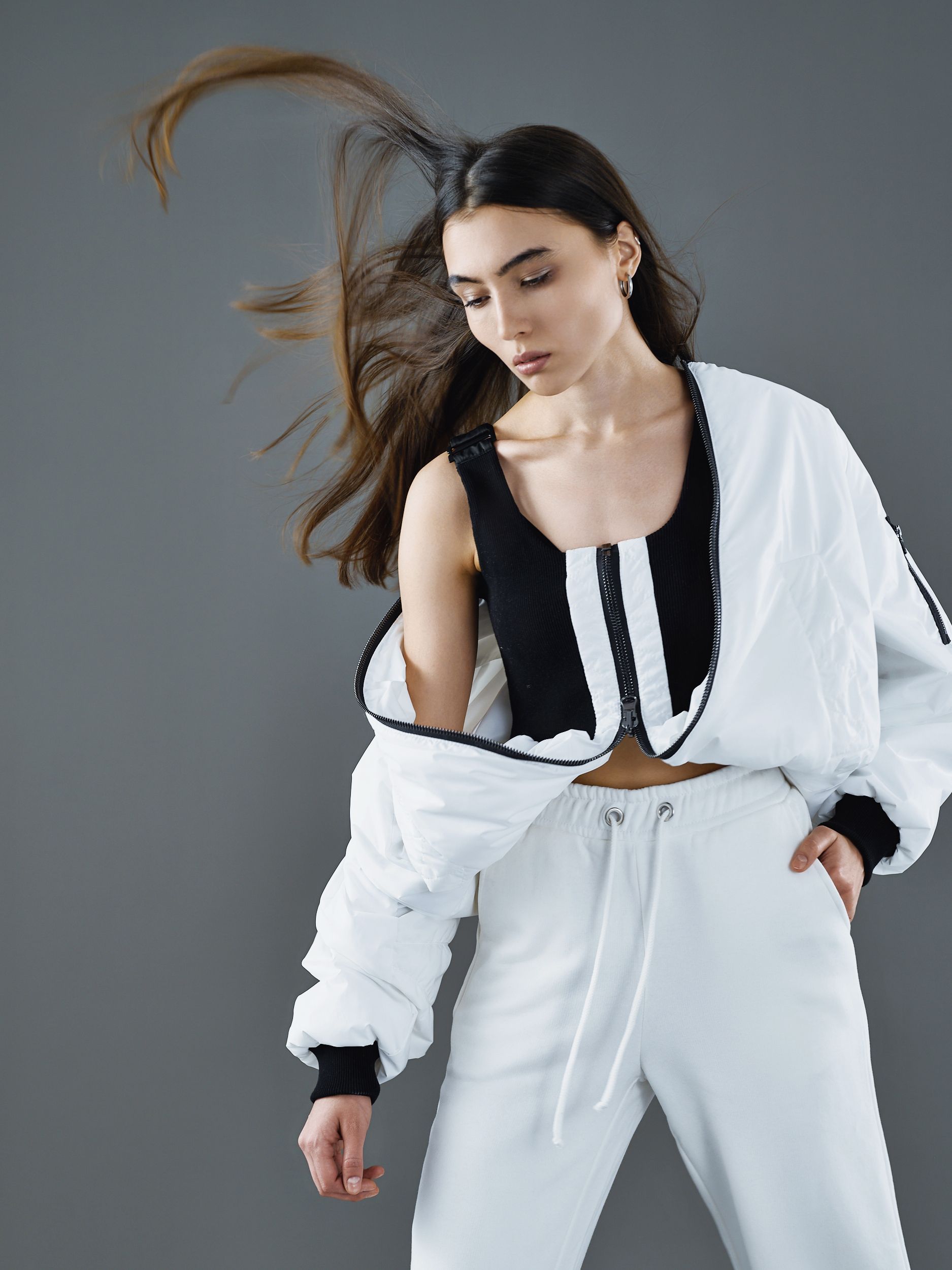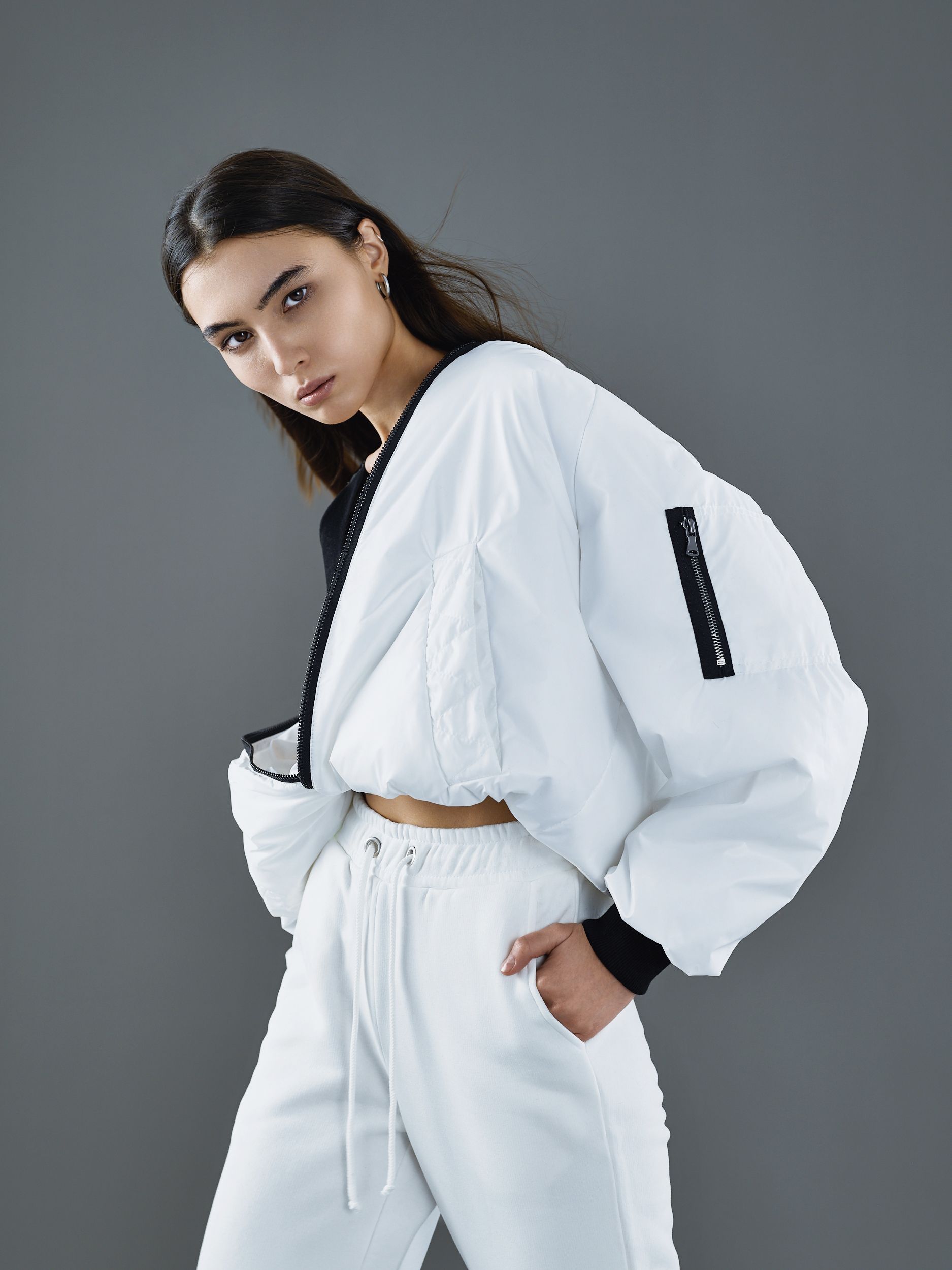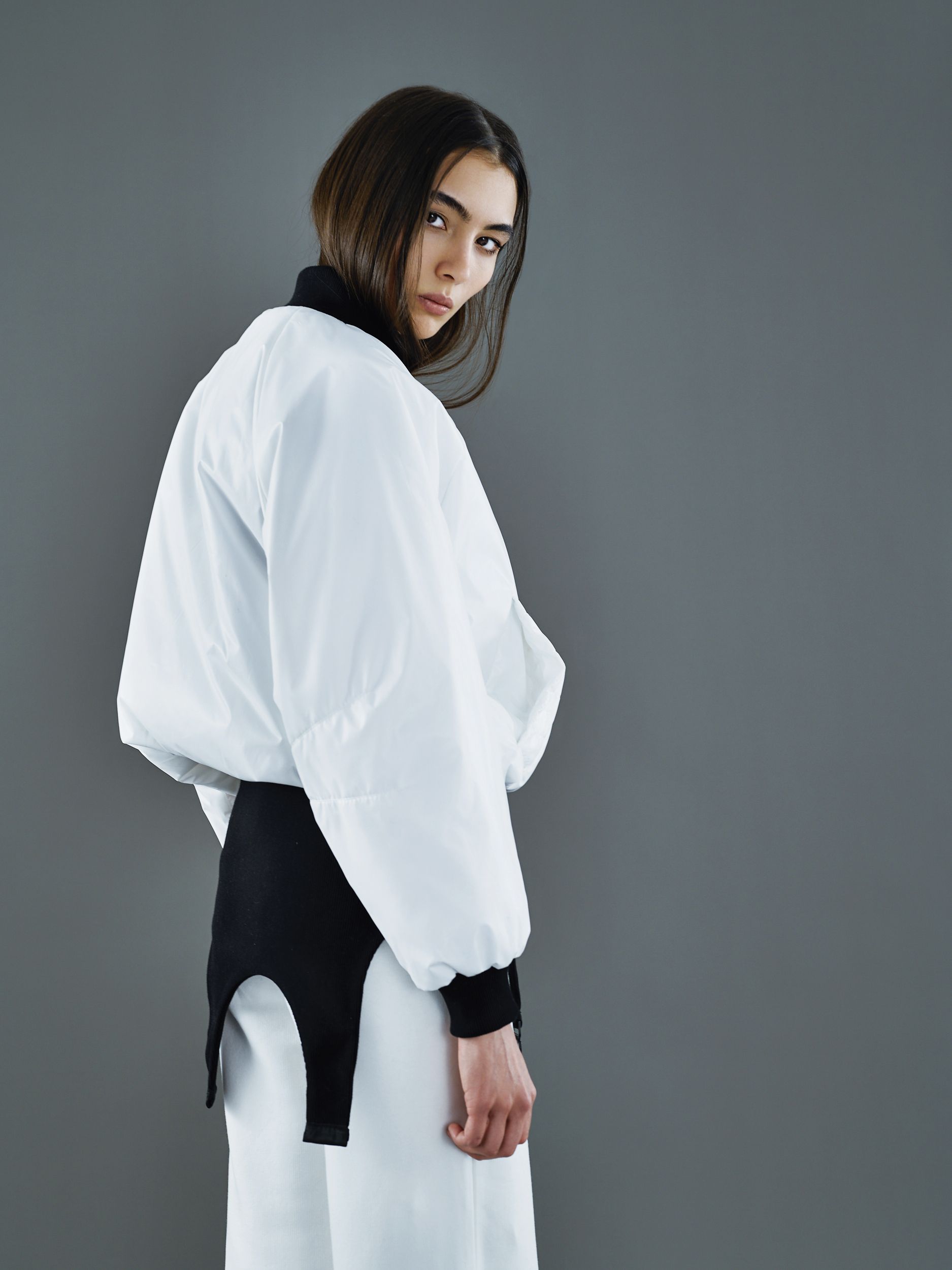 Белый бомбер-трансформер с эластичными низом, стилизованным под пояс для чулков.