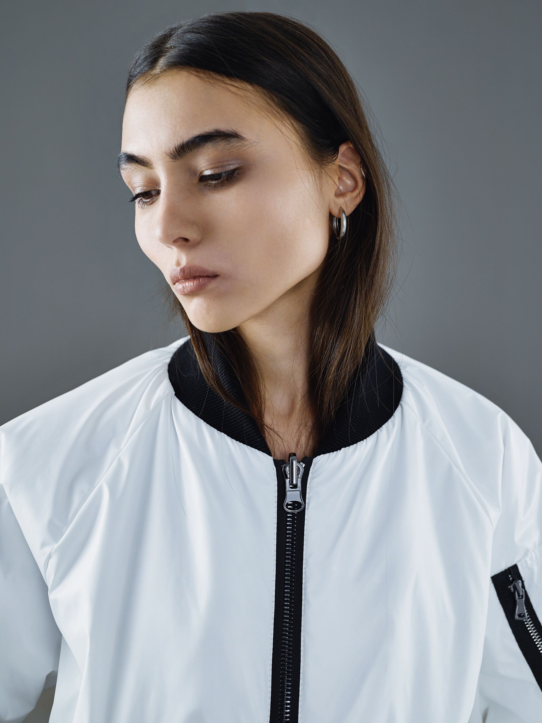 Массивная реверсивная металлическая молния позволяет удобно застёгивать бомбер с двух сторон. Куртка имеет два прорезных кармана с фактурными листочками и один накладной карман на рукаве с молнией. На изнаночной стороне также есть два кармана на молнии.