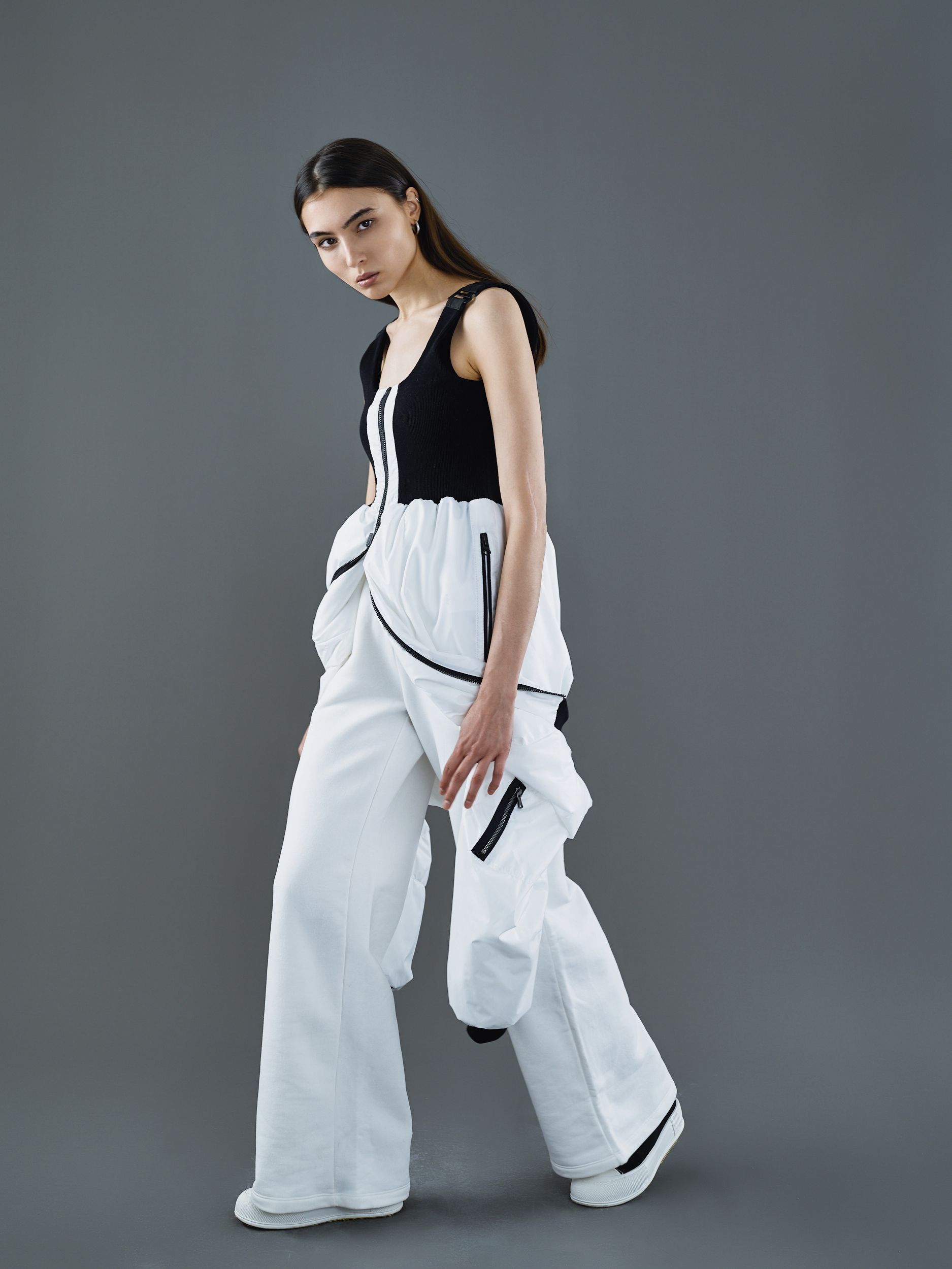Металлические рамки низа возможно соединить между собой, чтобы трансформировать бомбер в трикотажную майку с поясом в виде бомбера. В этой трансформации также есть возможность надеть куртку вторым слоем.
