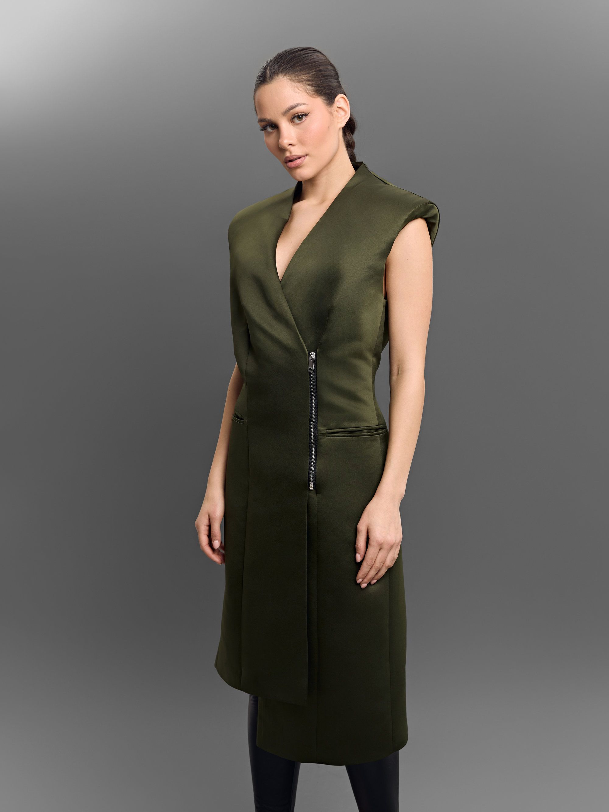 Платье с увеличенной линией плеч, с ассиметричным низом и косой застежкой молнией. На подкладке из вискозы.