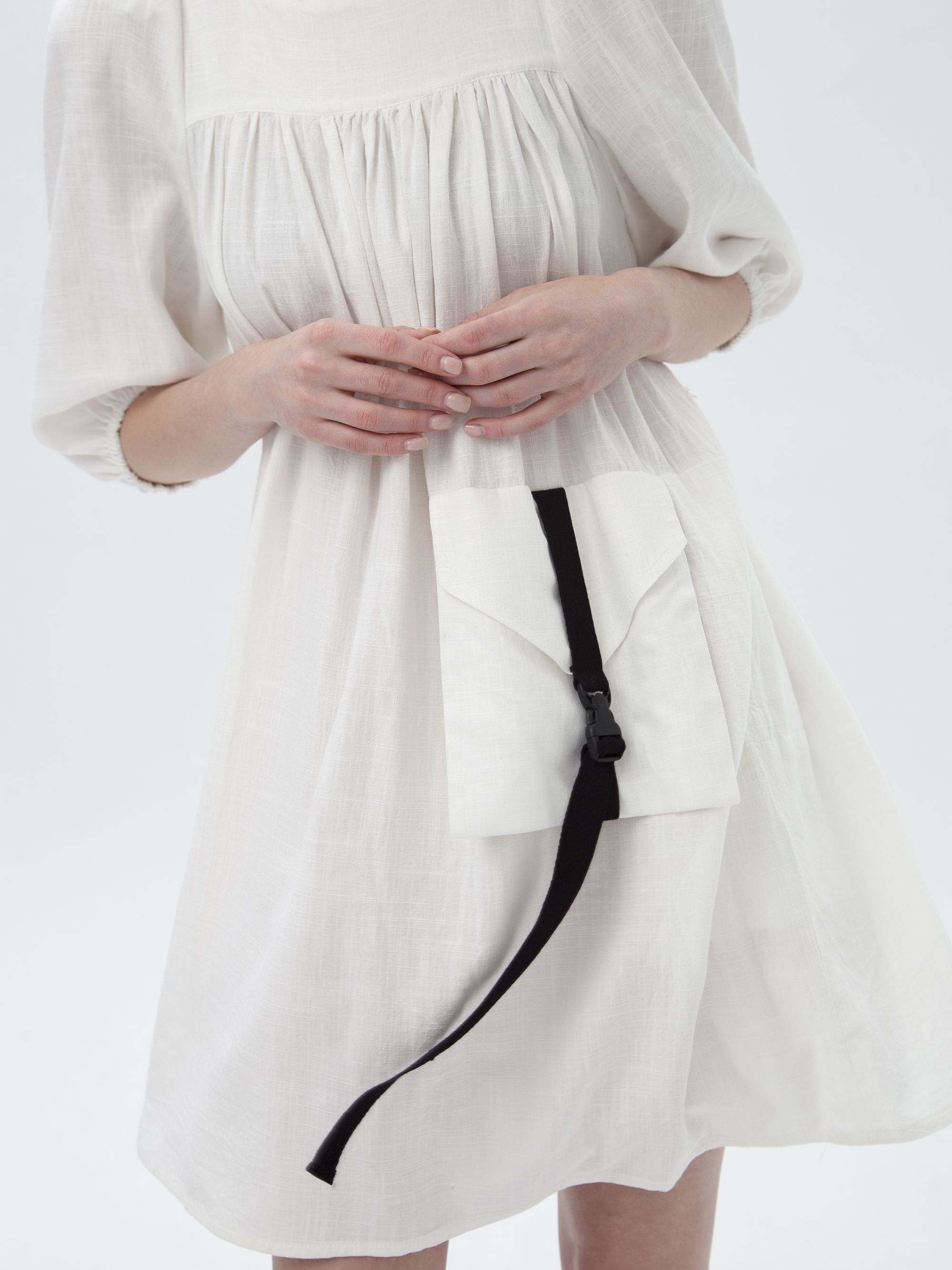 Воздушное, свободное платье из льна, длиной выше колена.