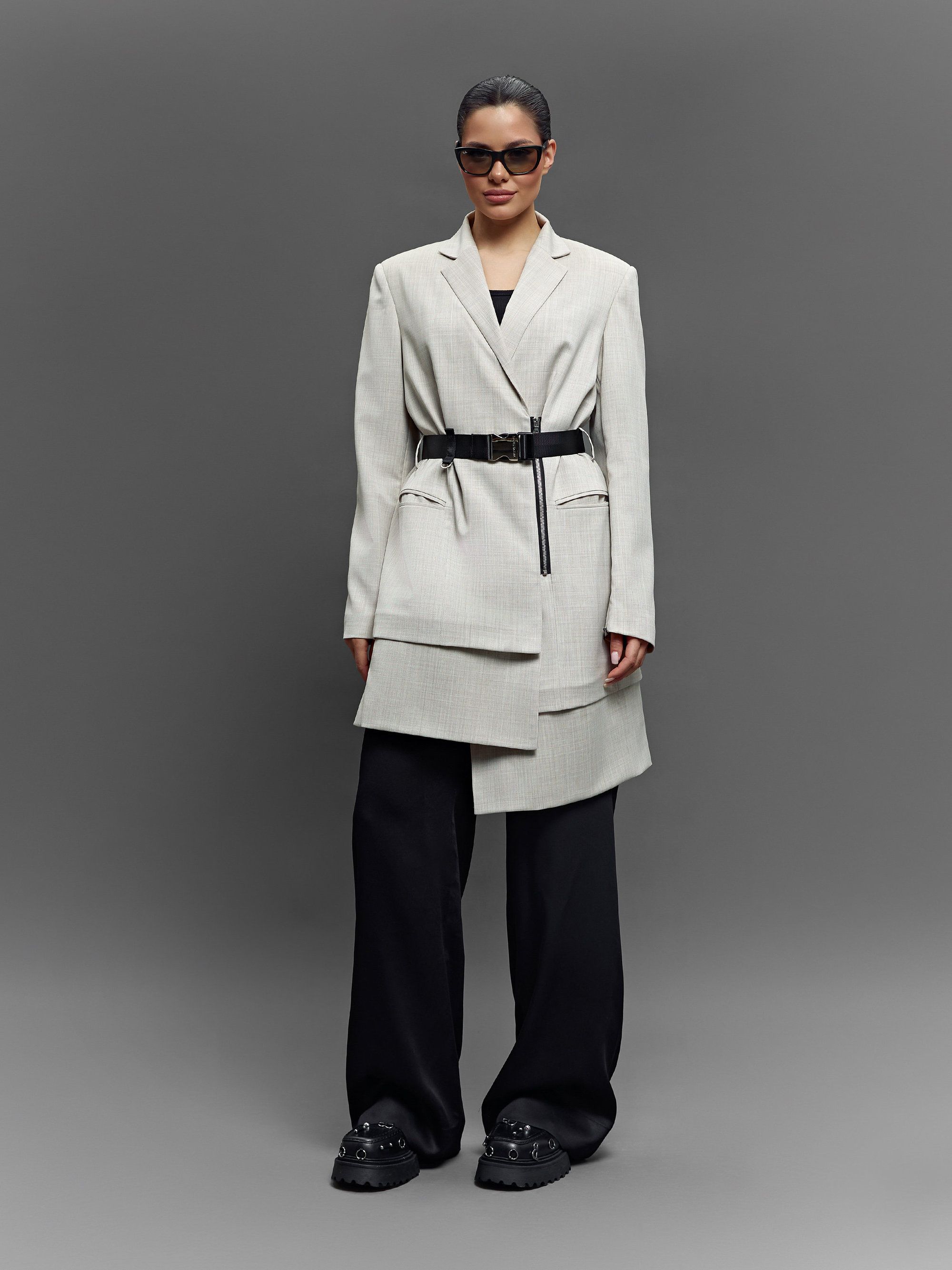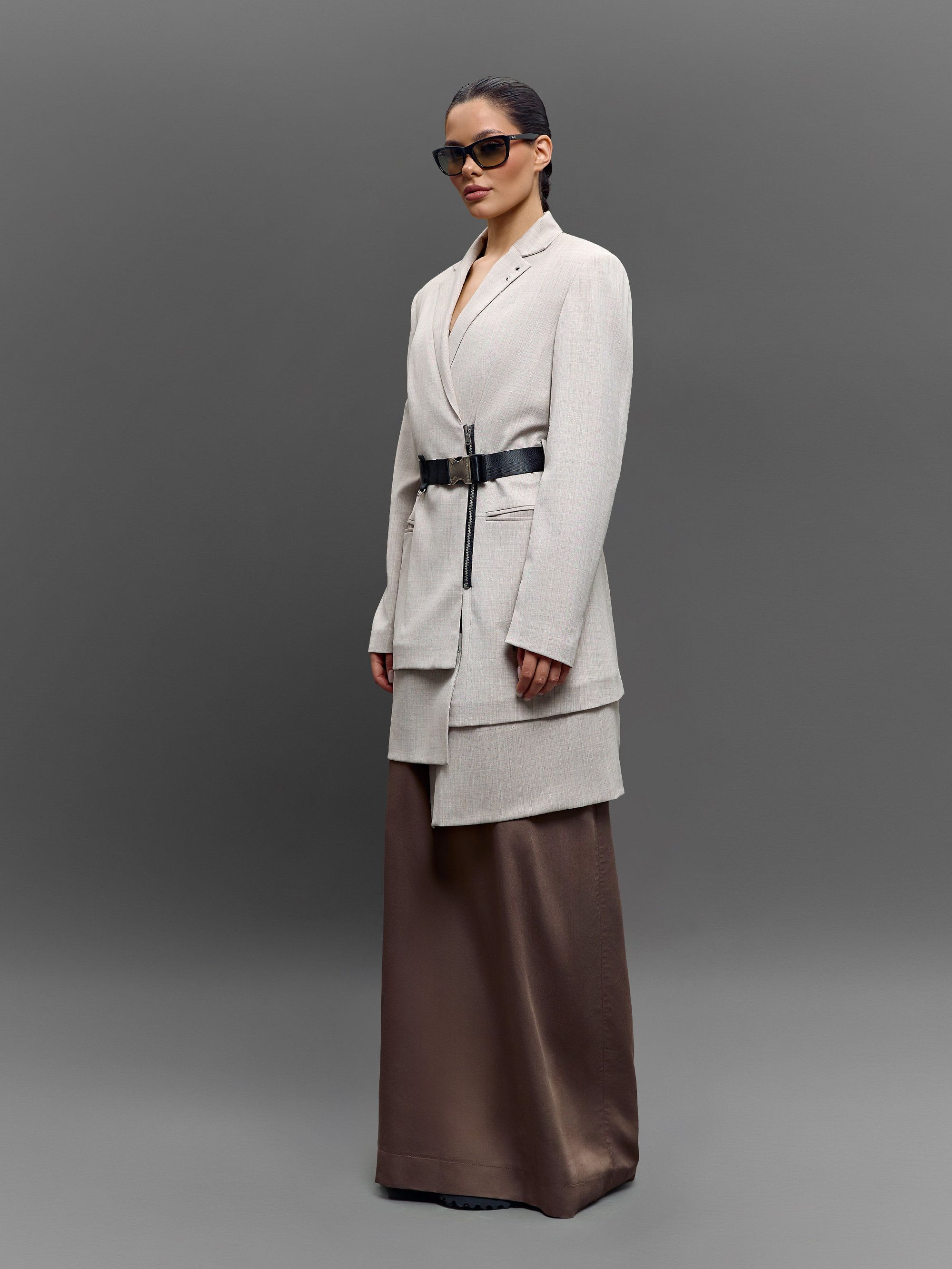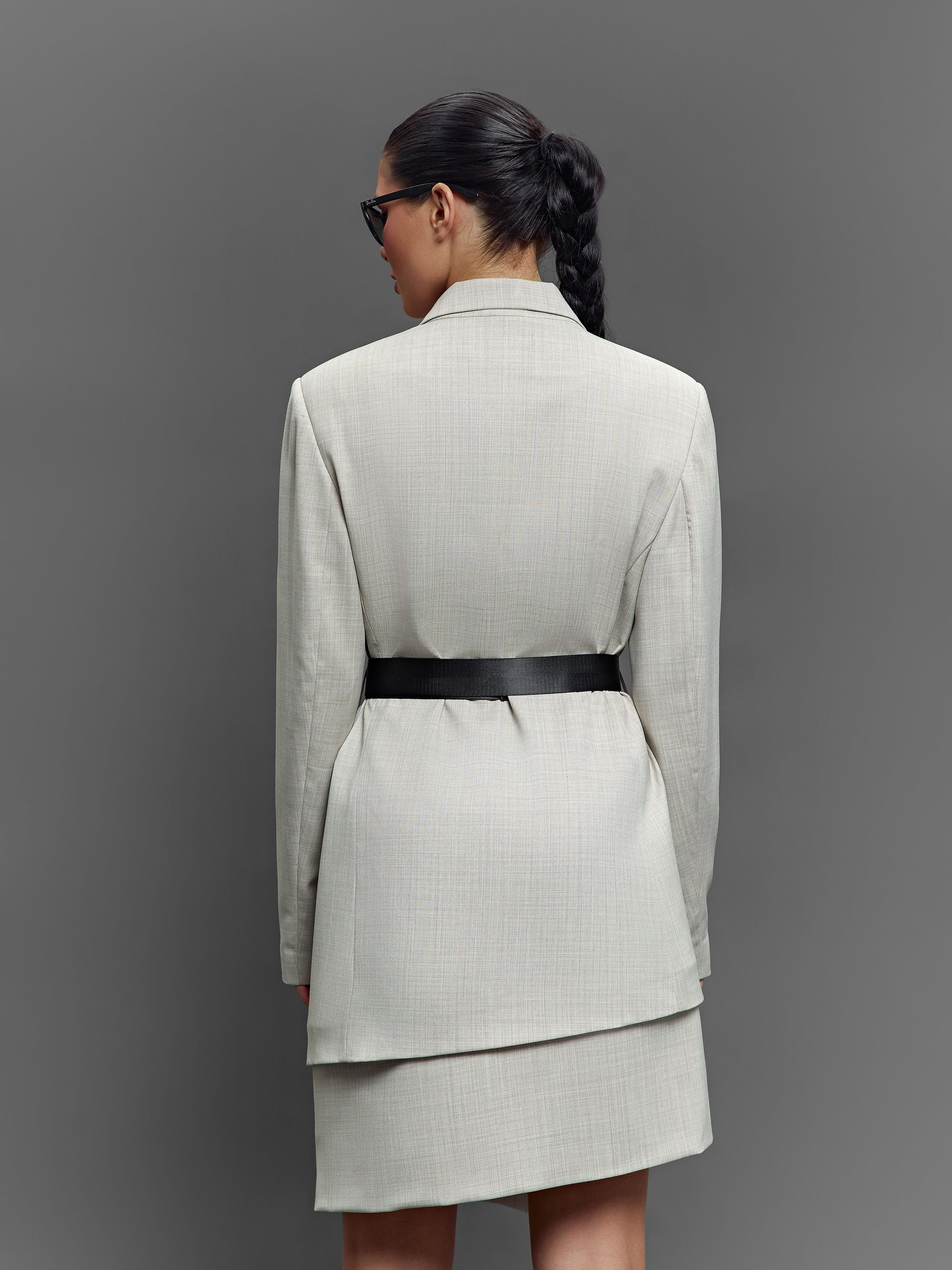- Удлинённый многослойный пиджак можно носить как платье или как жакет – отстегнув нижний слой.