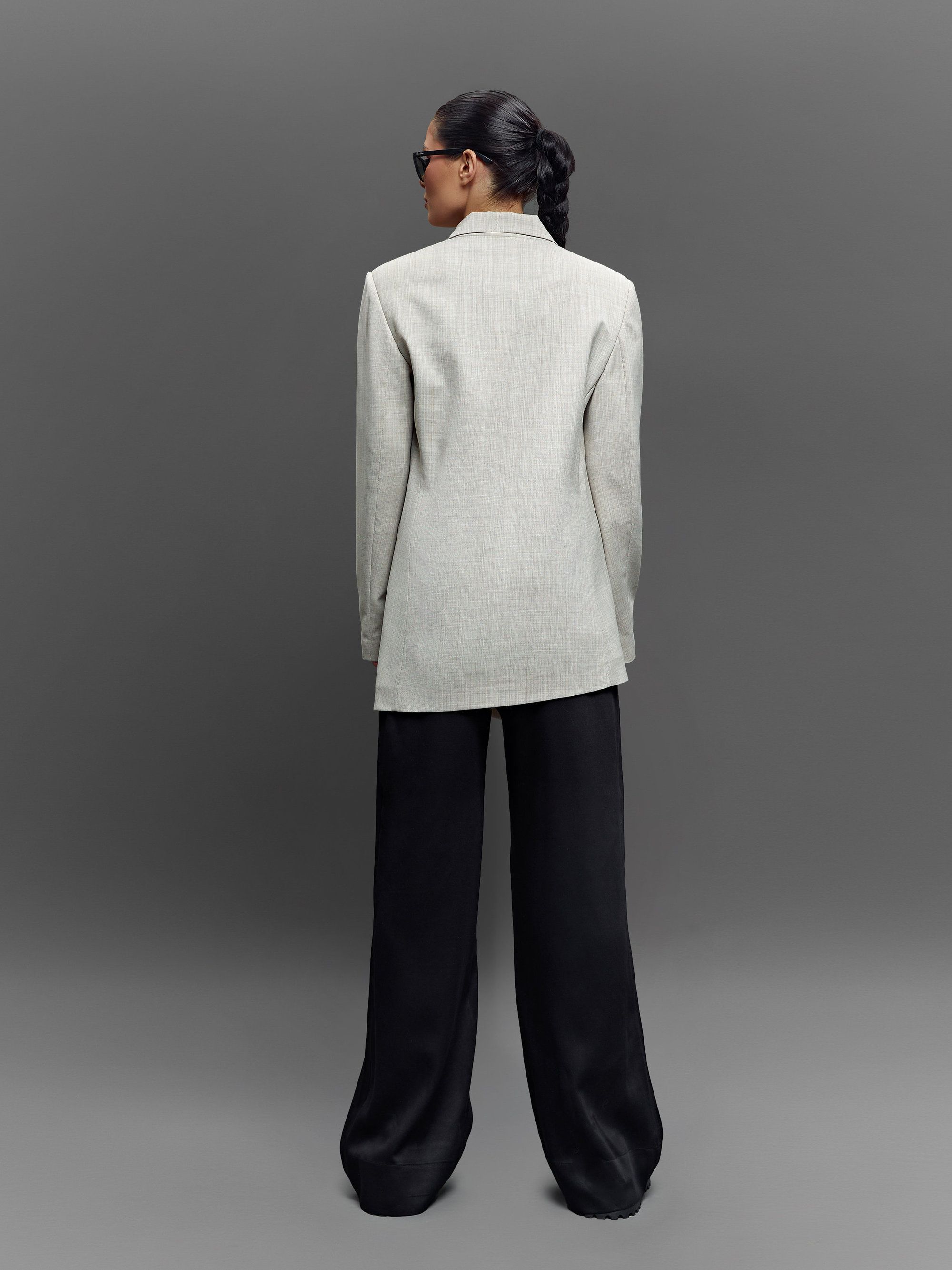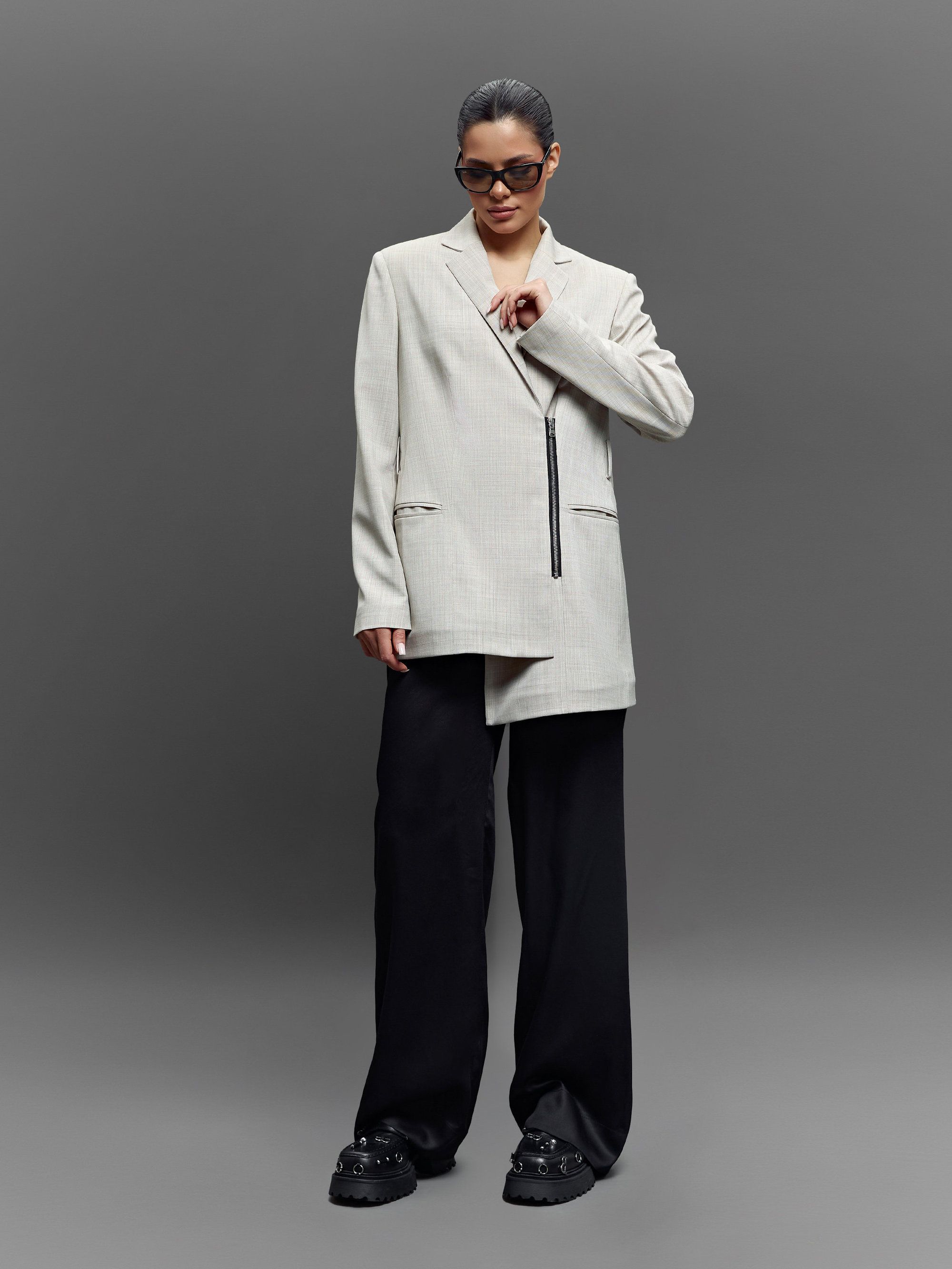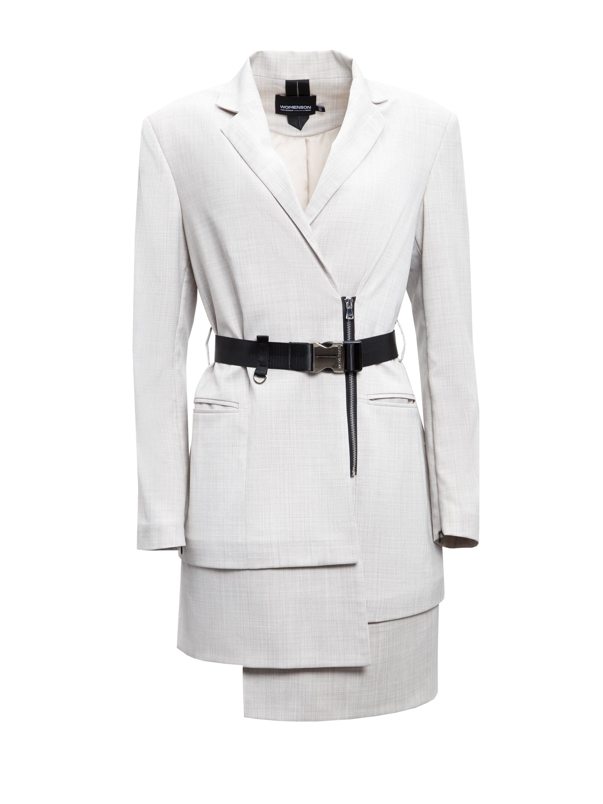 - Удлинённый многослойный пиджак можно носить как платье или как жакет – отстегнув нижний слой.