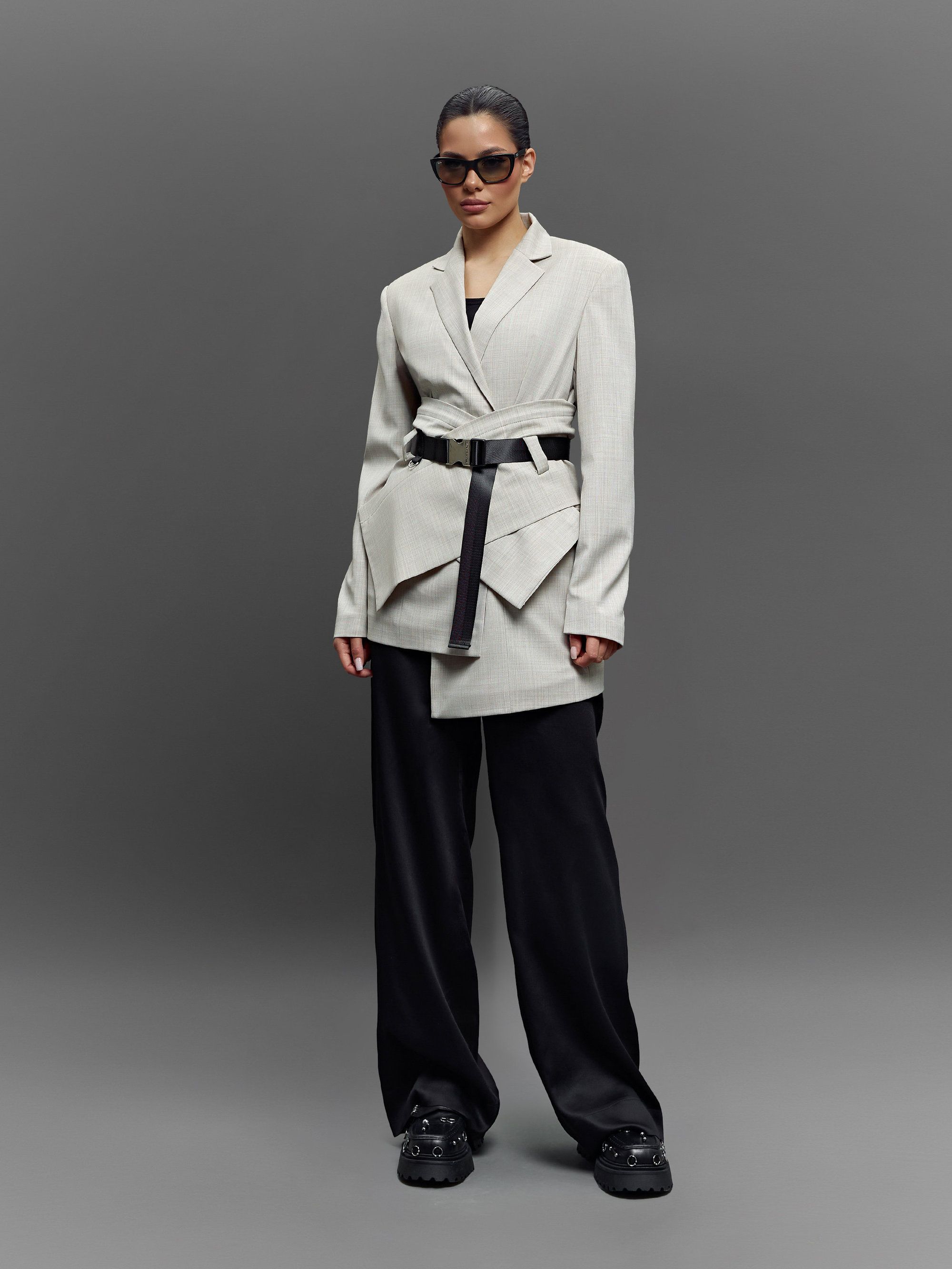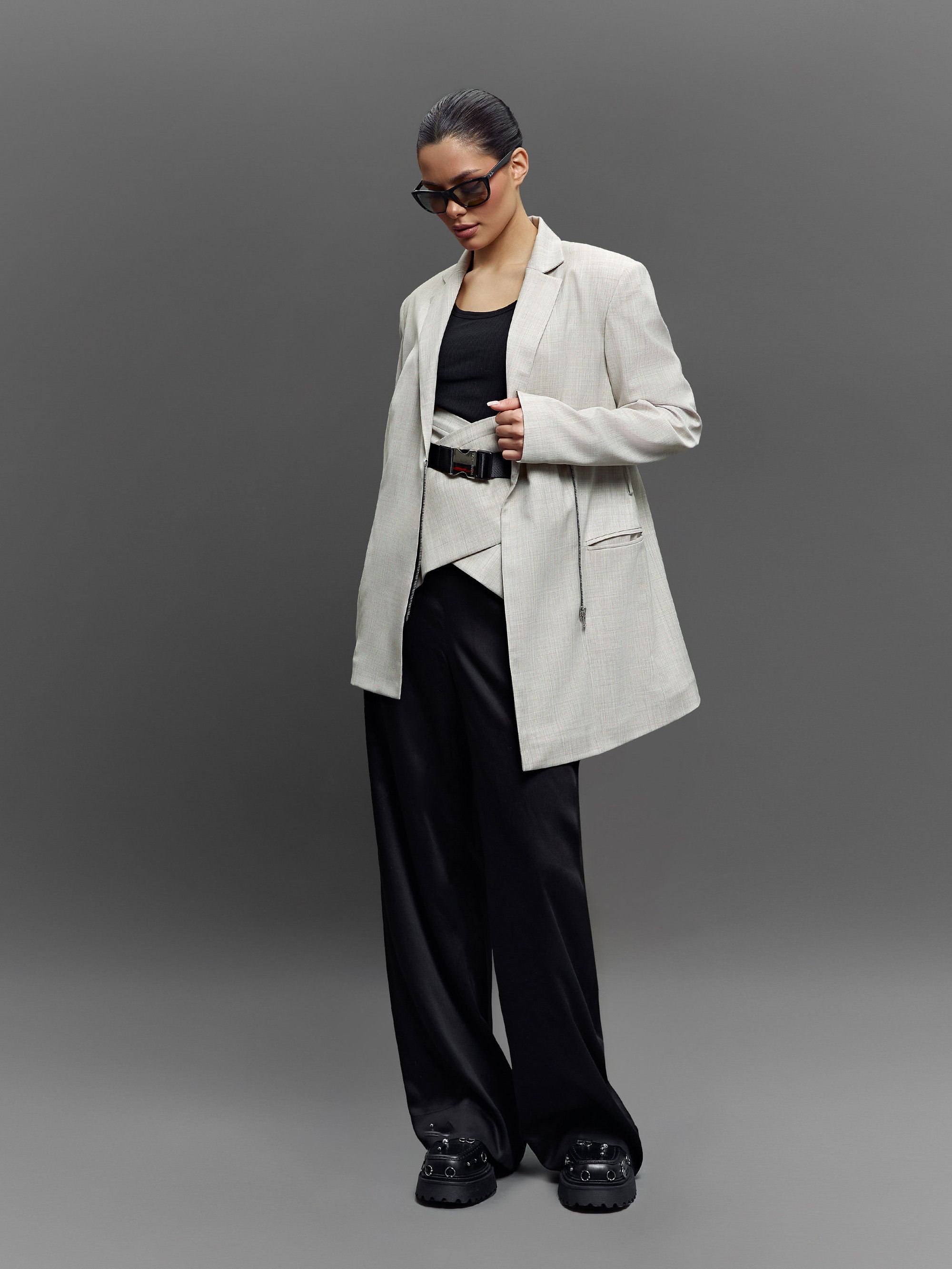 - Нижний слой платья-пиджака можно носить поверх жакета как пояс-камербант, закрепив его поясом-стропой или обернув вокруг талии для смены образа.