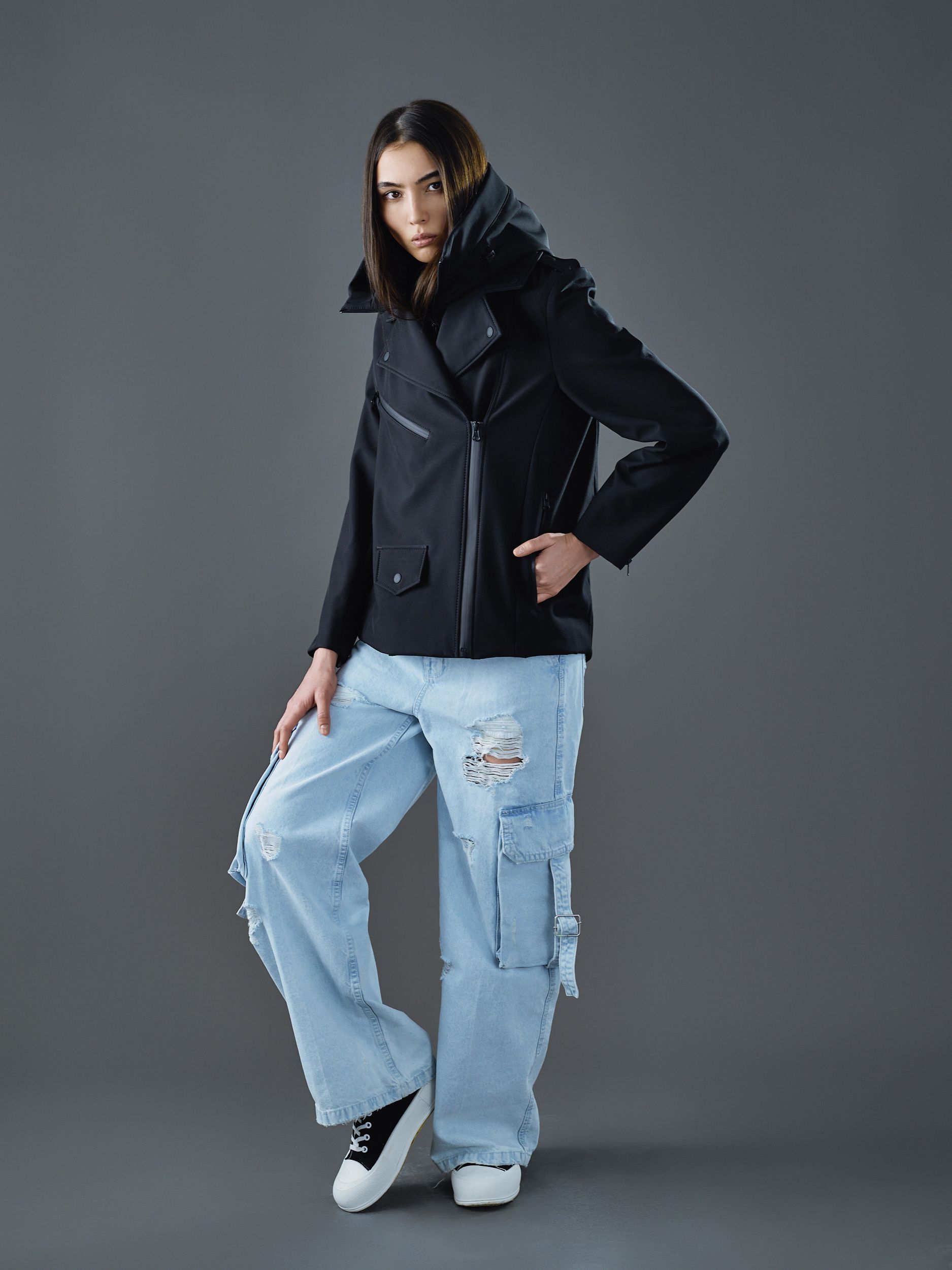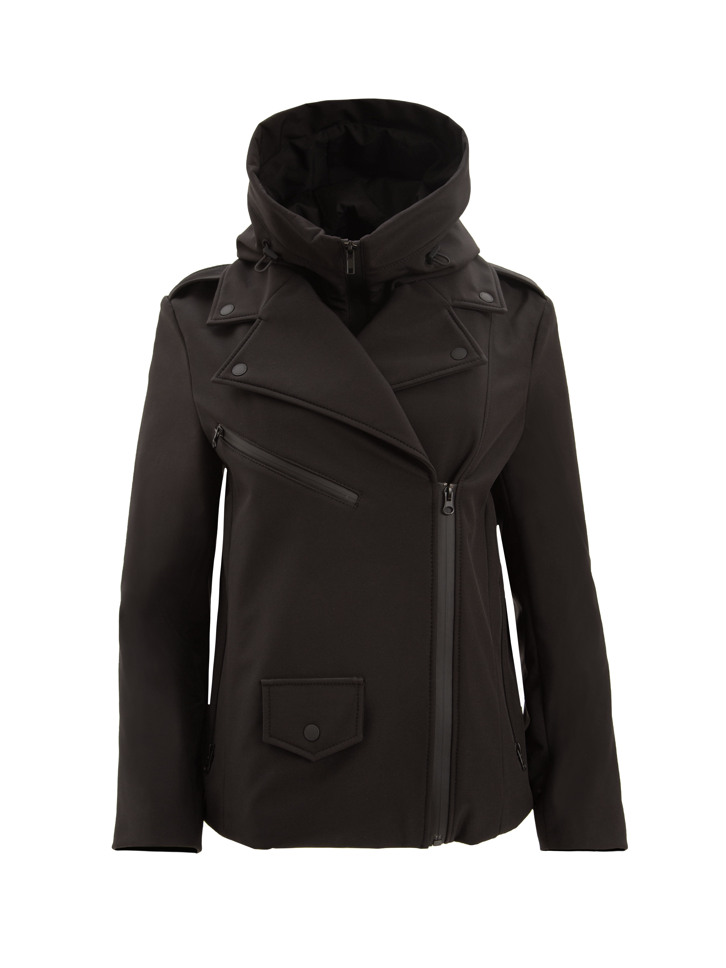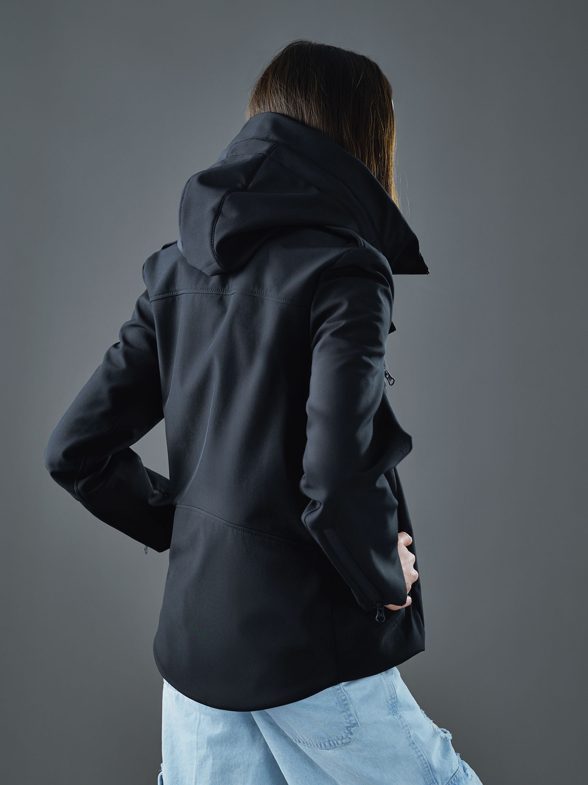 Классическая косуха, выполненная из технологичного софтшелла, с черными матовыми кнопками и водоотталкивающими молниями.