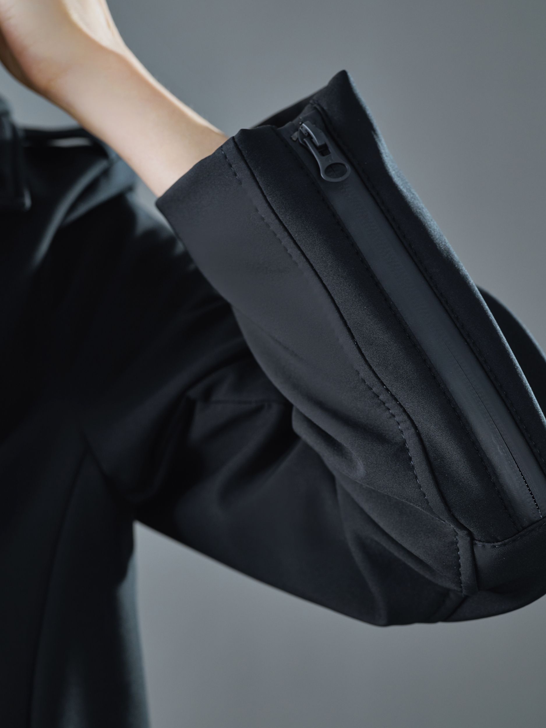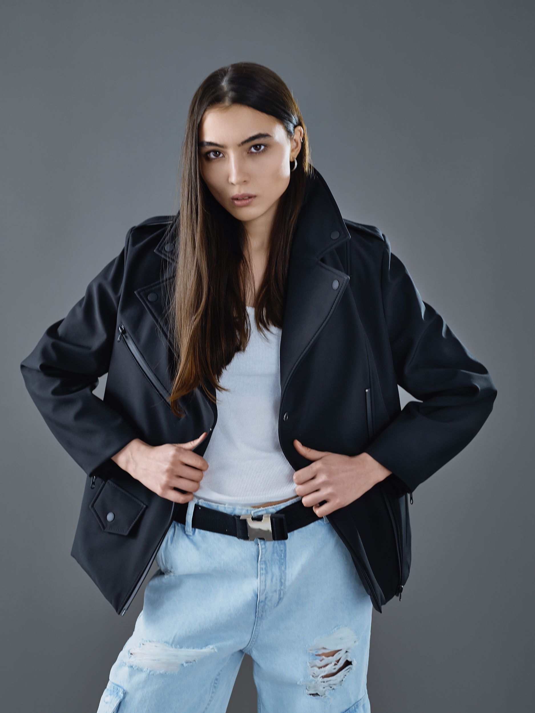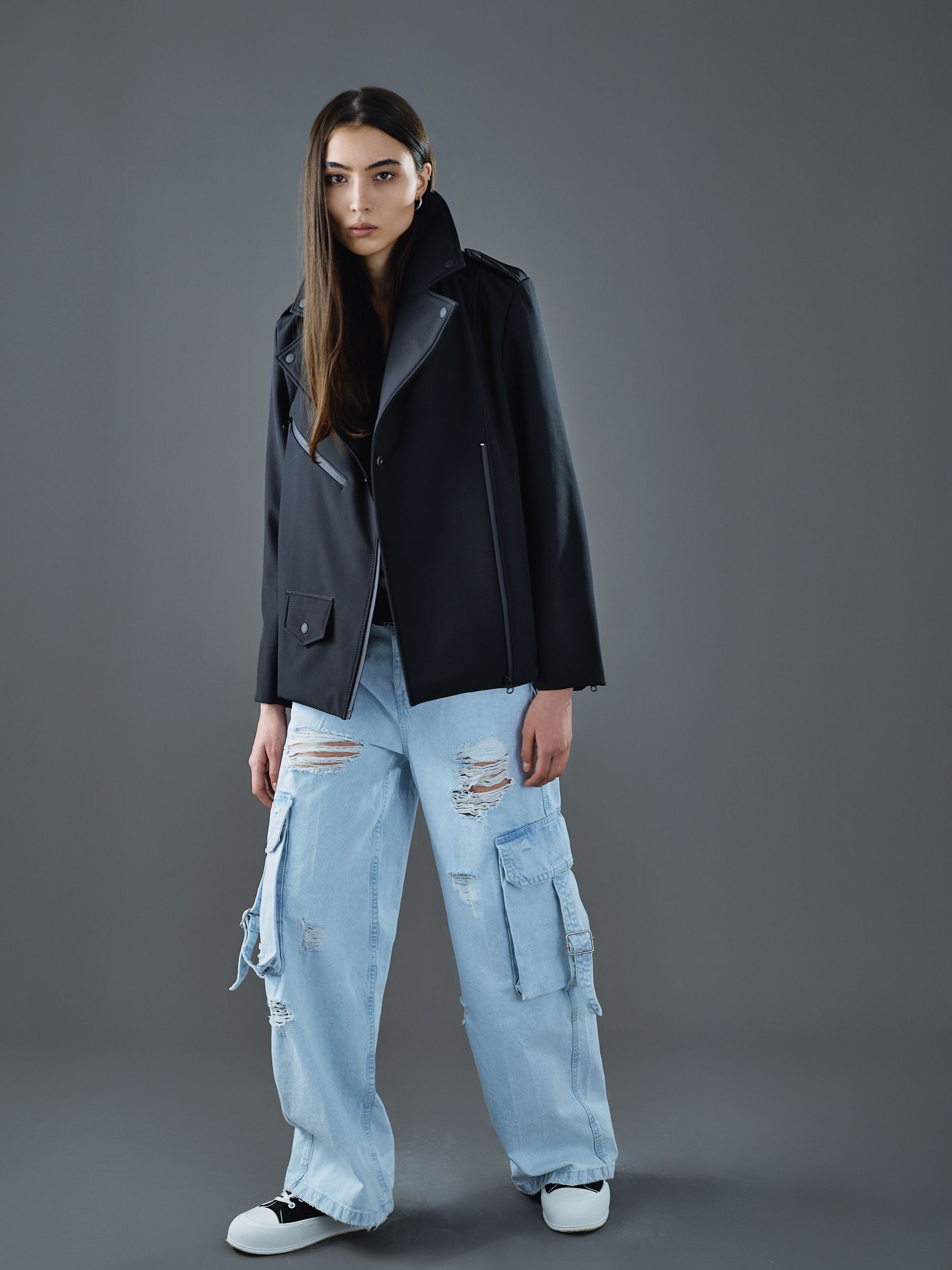 Классическая косуха, выполненная из технологичного софтшелла, с черными матовыми кнопками и водоотталкивающими молниями.