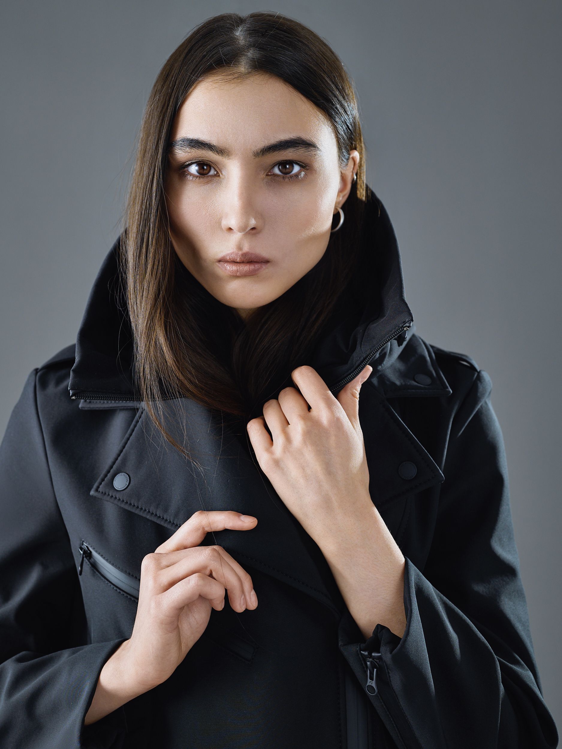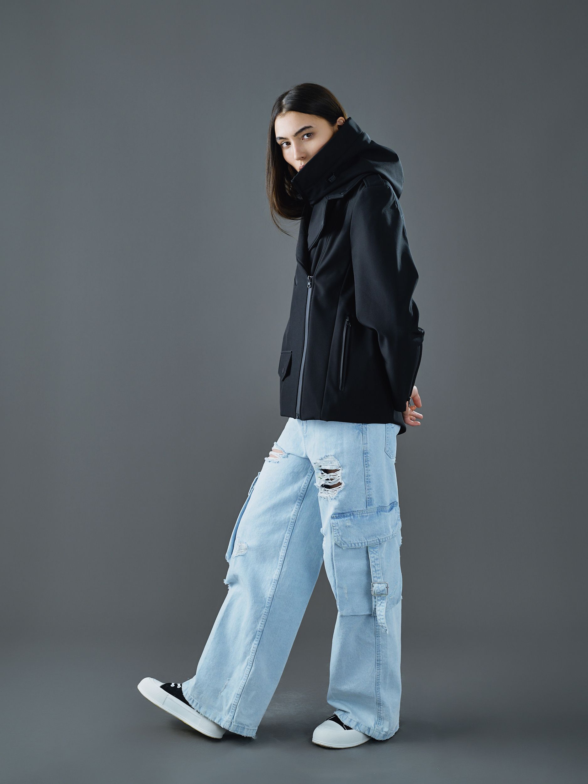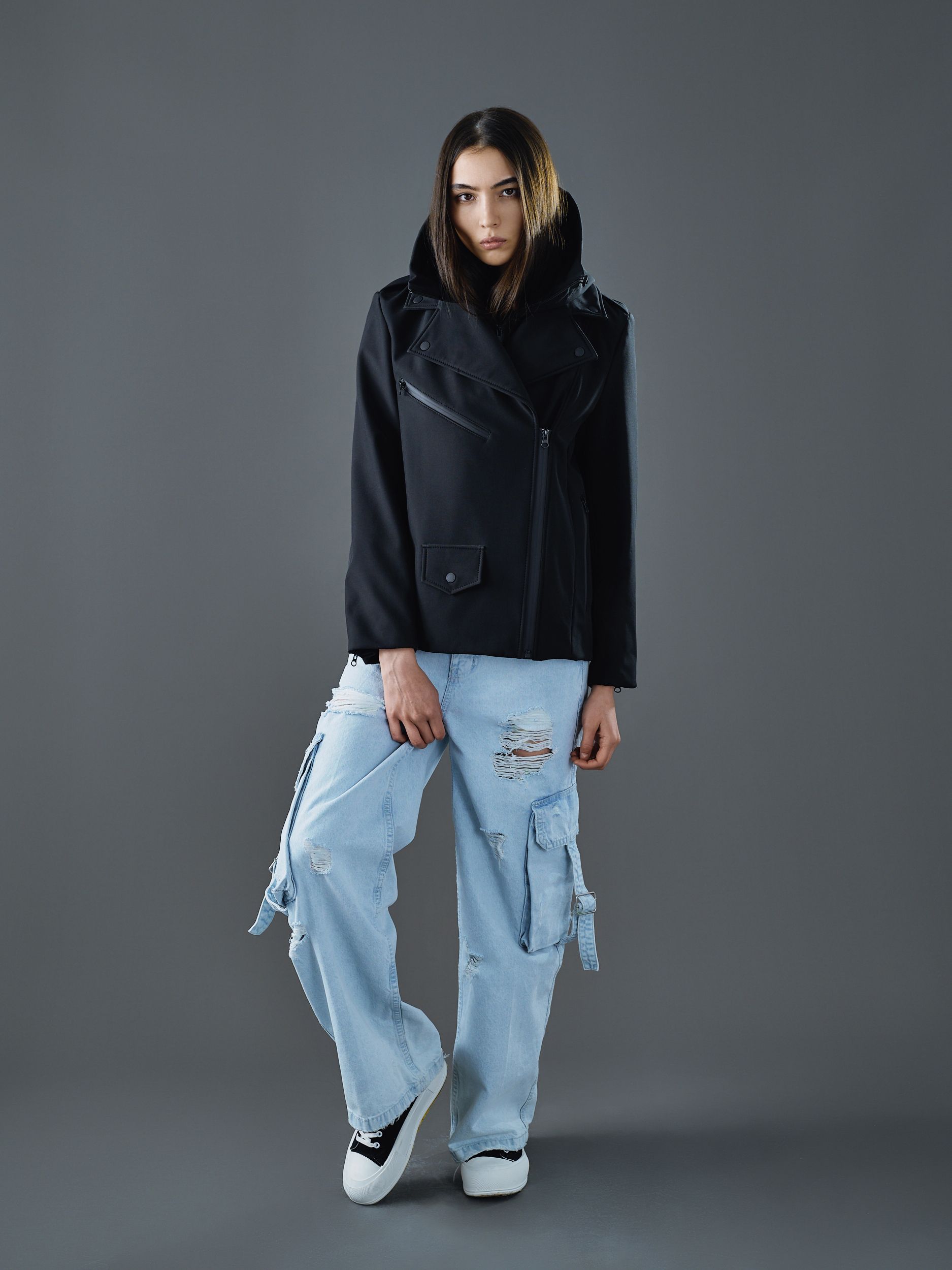 Дополнена фирменной съёмной капюшон-манишкой – визитной карточкой бренда для демисезонных коллекций. Манишка крепится к косухе с помощью молний.