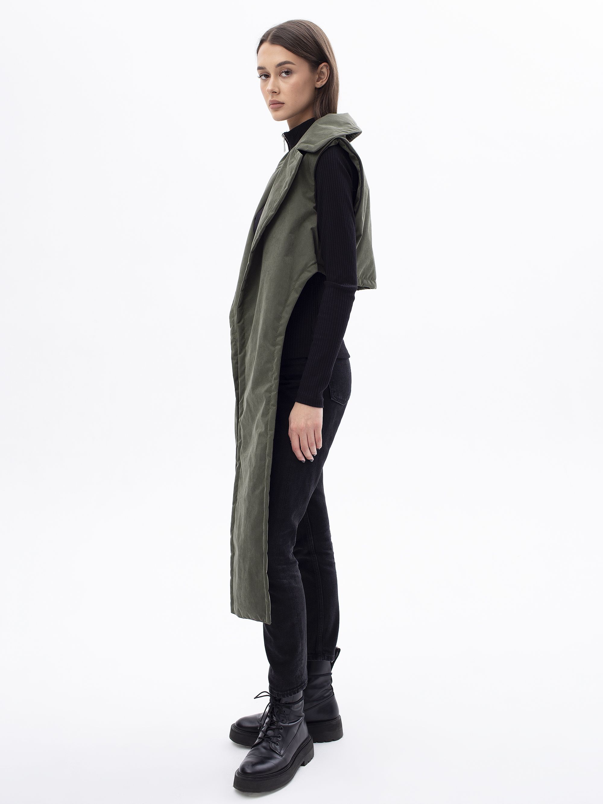 Съёмная жилетка с отложным воротником создаёт сложный многослойный образ, добавляя на спинке кокетку и отлетные детали на переде. Жилетка фиксируется на плечах с помощью молний.