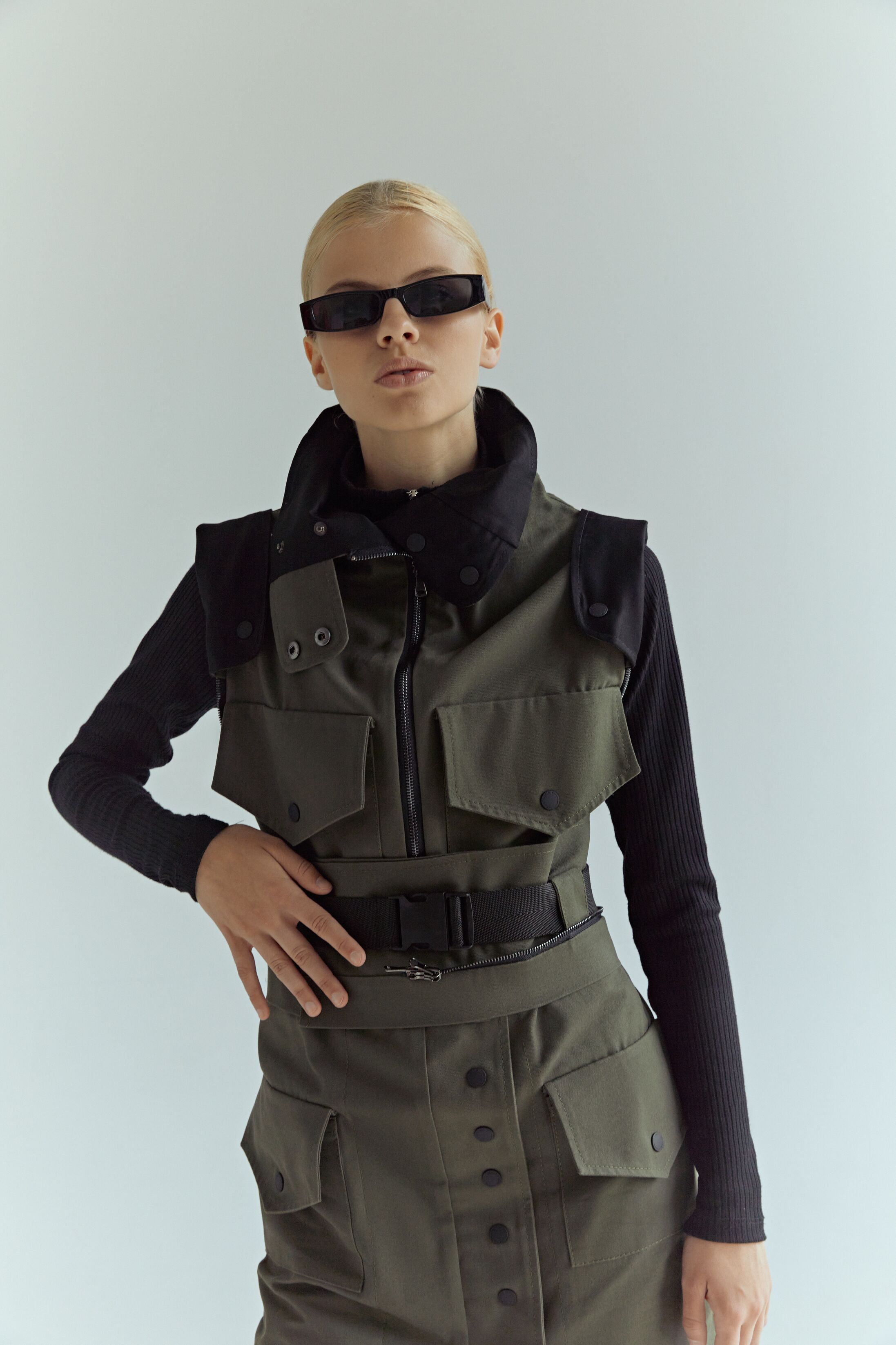 Выверните жилетку вместе с клапанами на плечах. Обратите внимание, жилетка обратной стороной застегивается на кнопки, а не на молнию. Также стоит иметь ввиду, что эта сторона жилетки выполнена из плотного хлопка без водоотталкивающей пропитки, и будет промокать под дождём. - Юбка