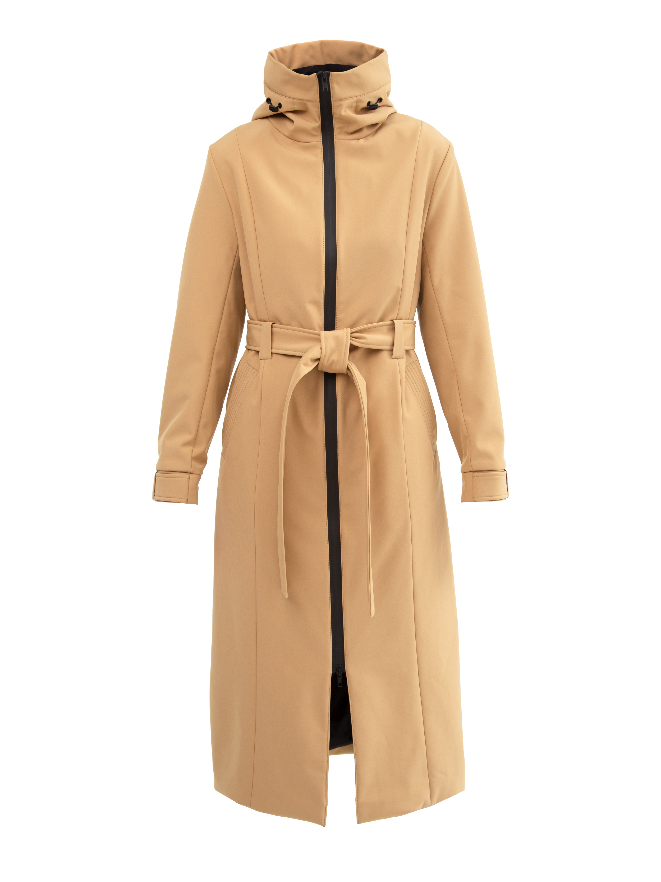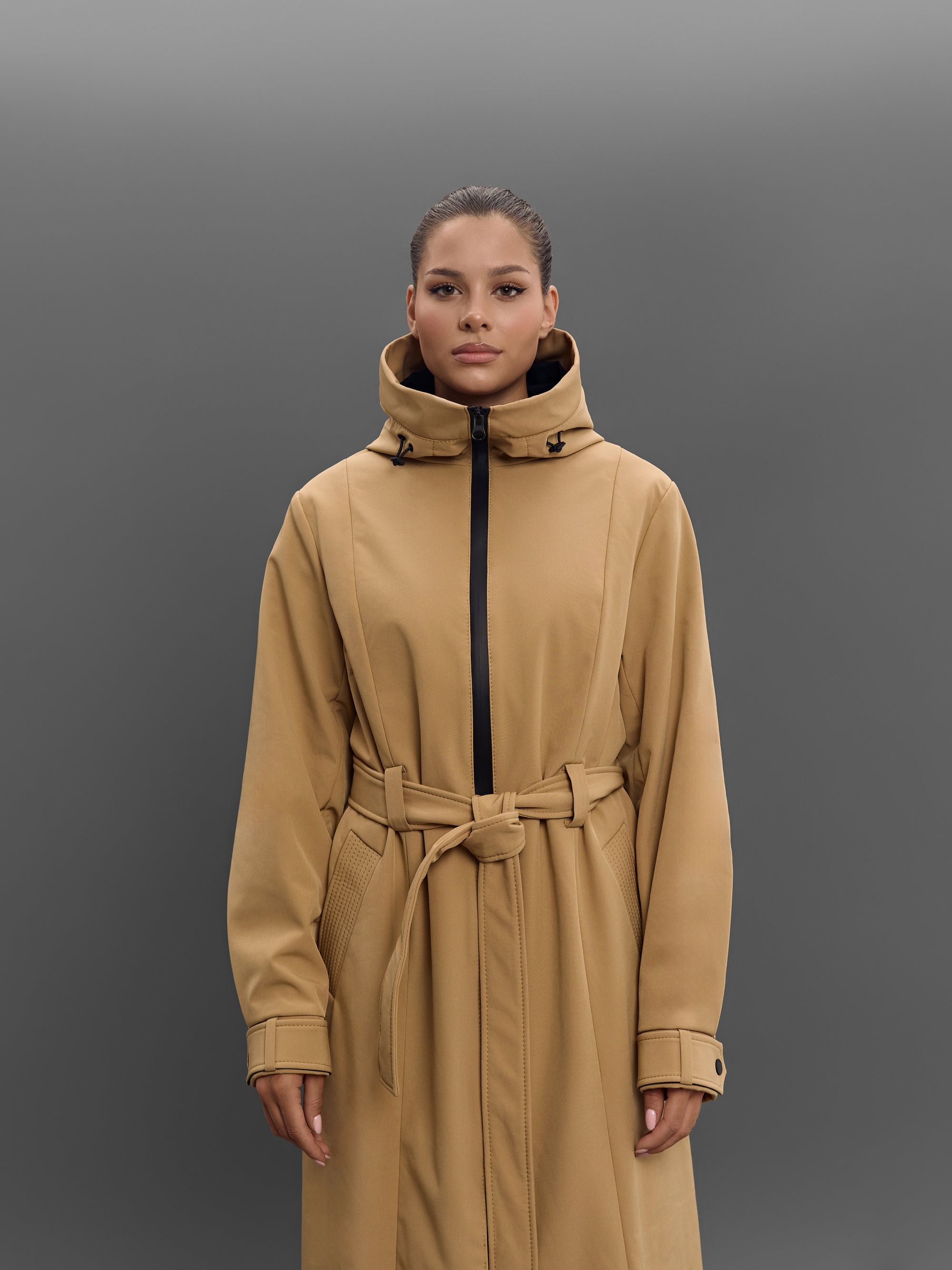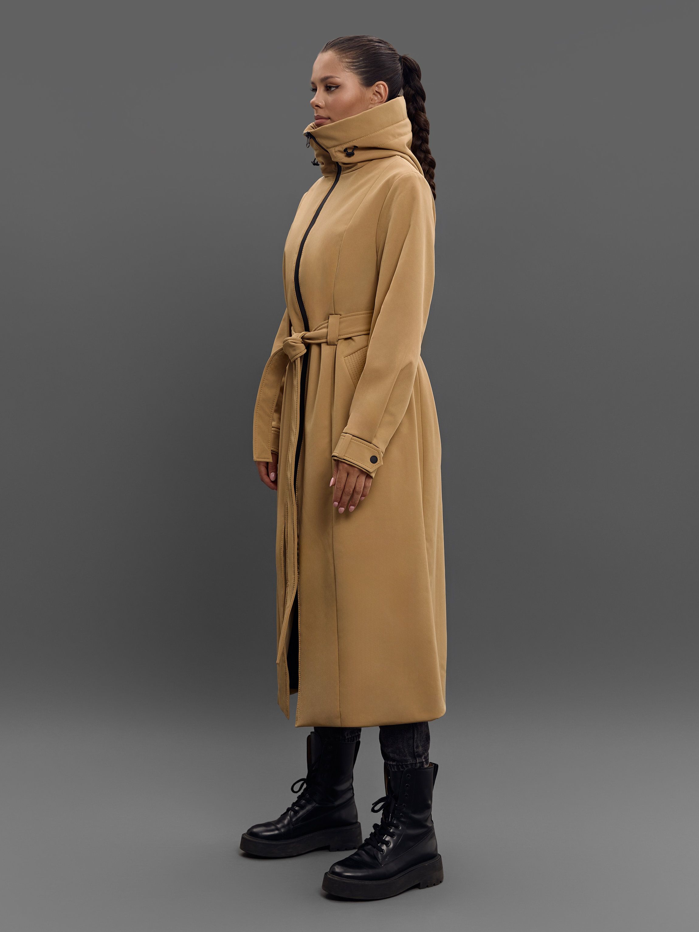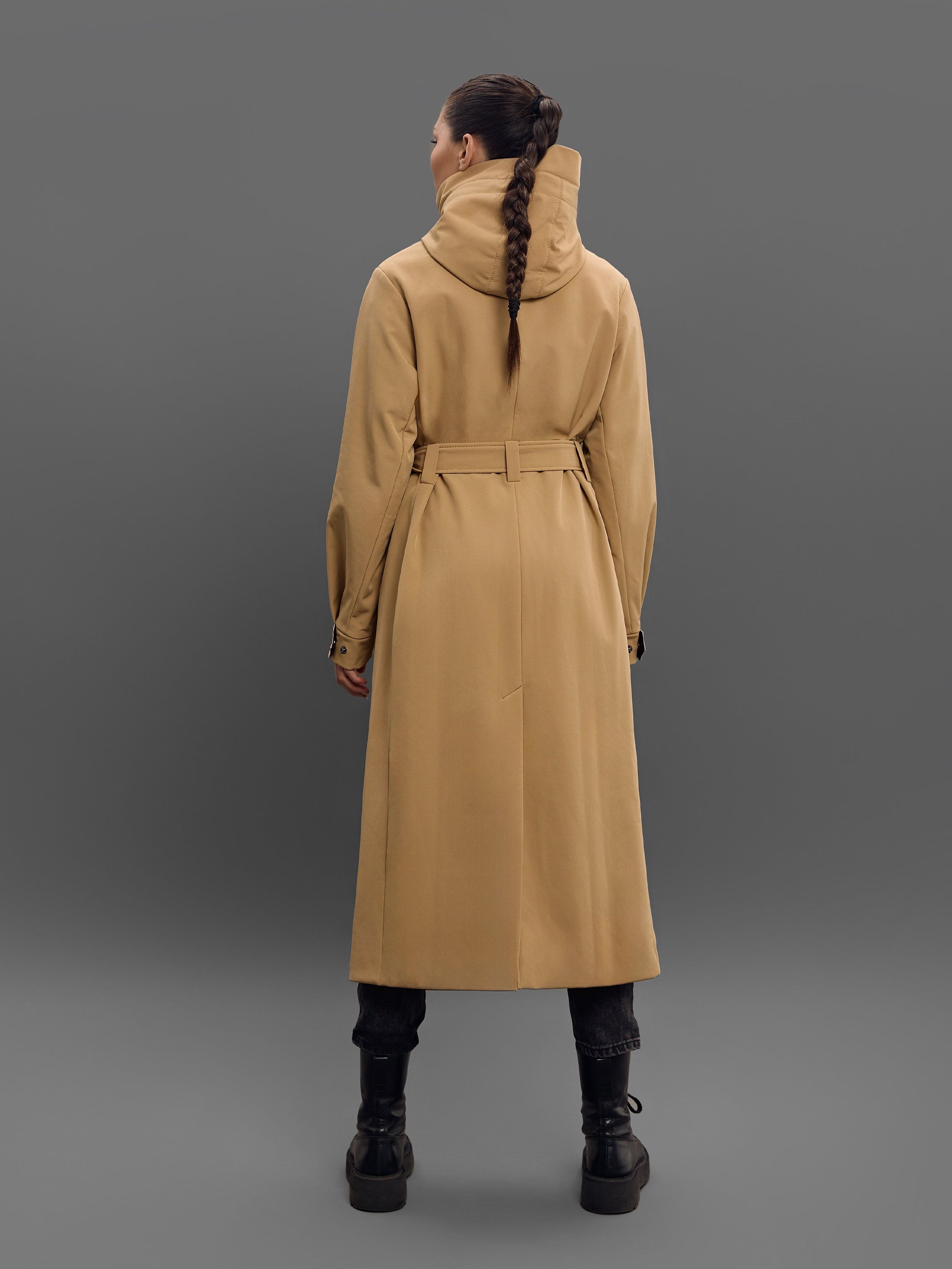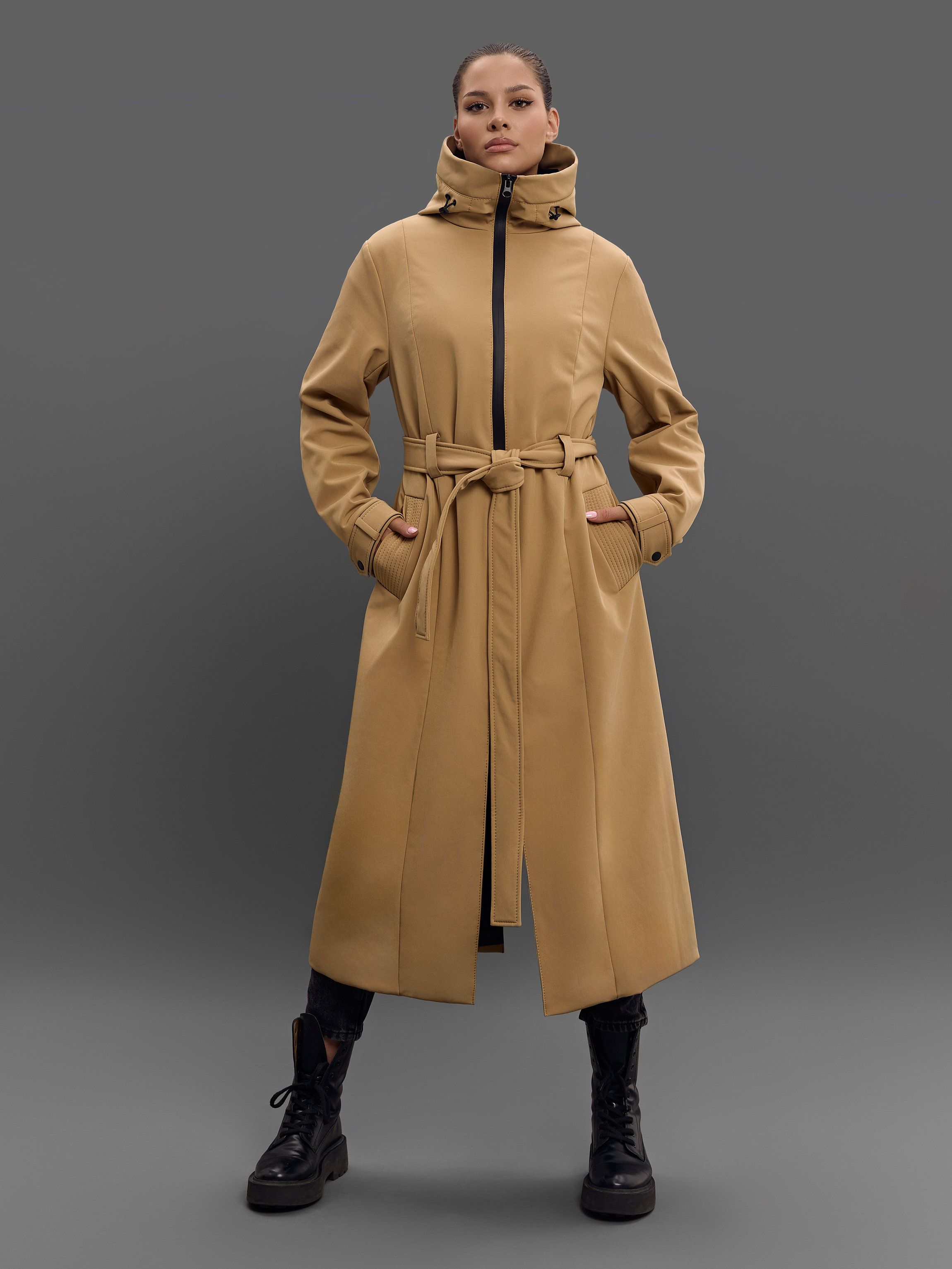 Утеплённый бежевый плащ B-Color Baza. Выполнен из софтшелла на подкладке из 50% вискозы. Имеет прорезные карманы спереди и вместительный внутренний карман на потайной молнии. Манжеты и капюшон регулируются.