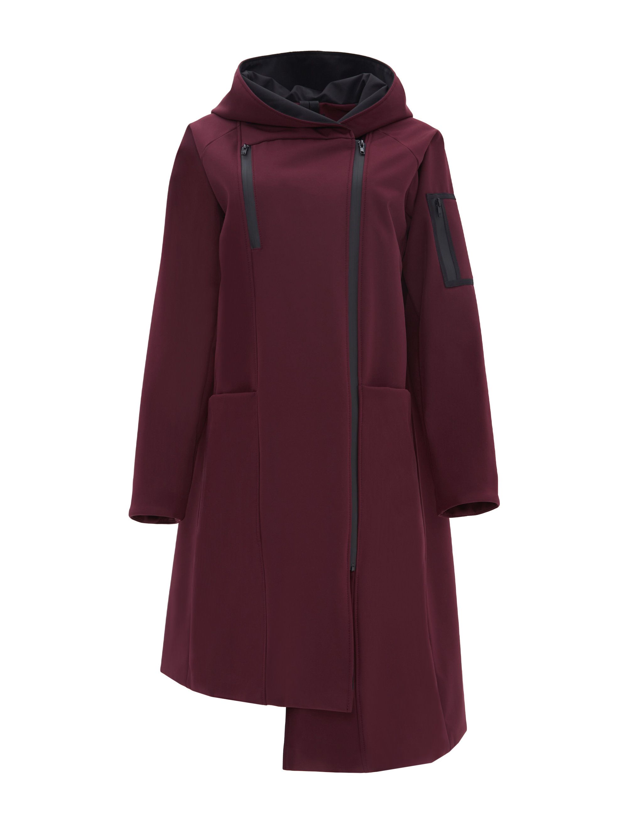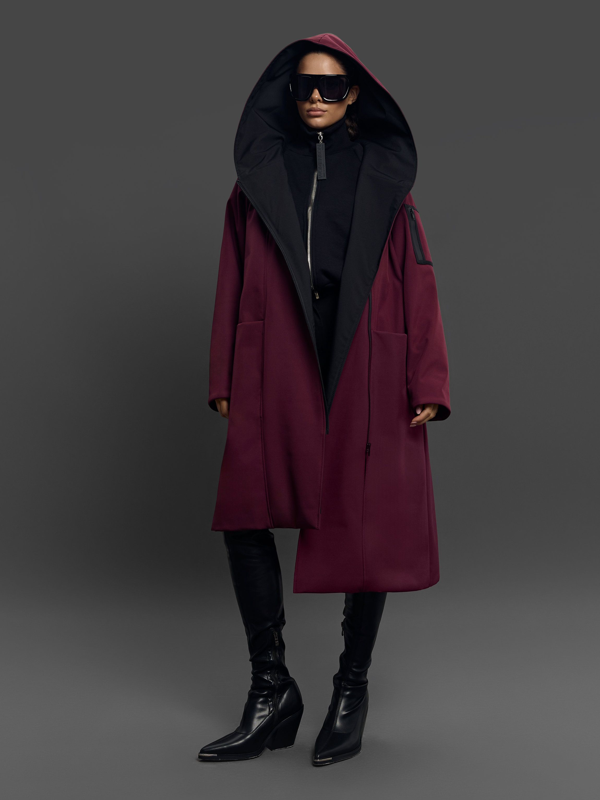 Контрастная подкладка плаща в расстёгнутом виде создаёт необычную драпировку. Два глубоких кармана интегрированных в боковые швы и один внутренний на молнию. Застёжка на водоотталкивающую молнию.