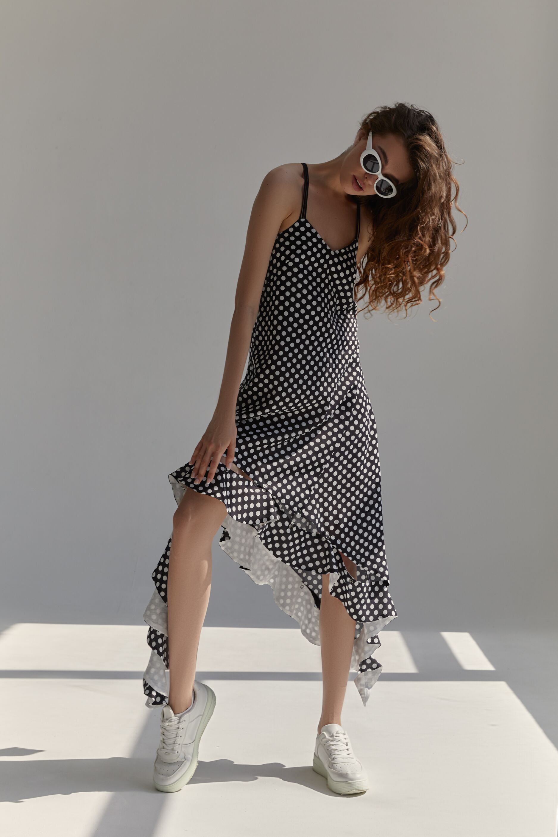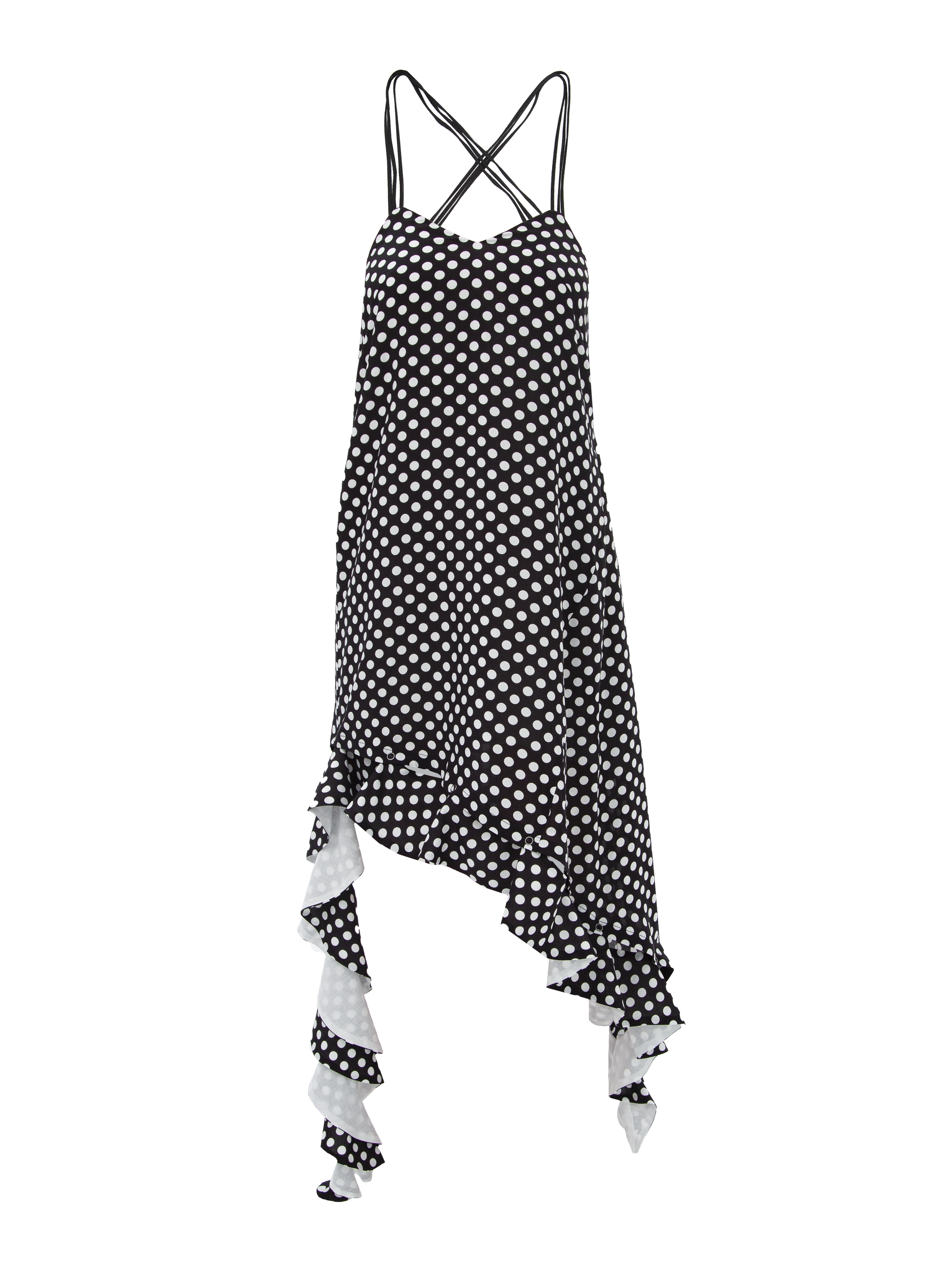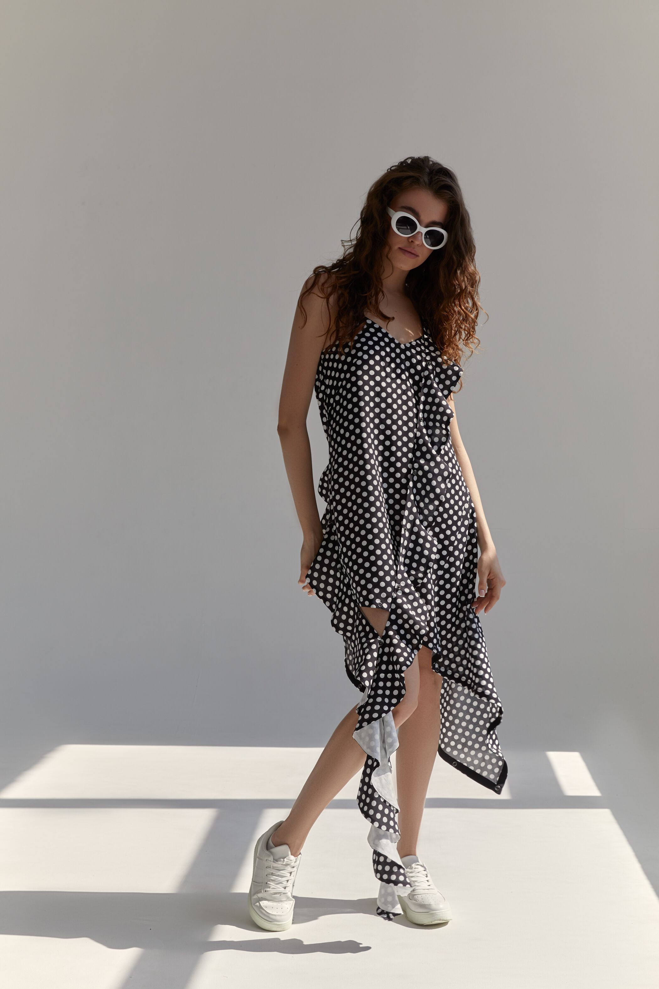 Основной изюминкой сарафана является съёмный волан. Он отстёгивается полностью, либо частично, оставляя пикантные гранжевые пропуски. Волан можно перекинуть через плечо или носить на шее как шарф.