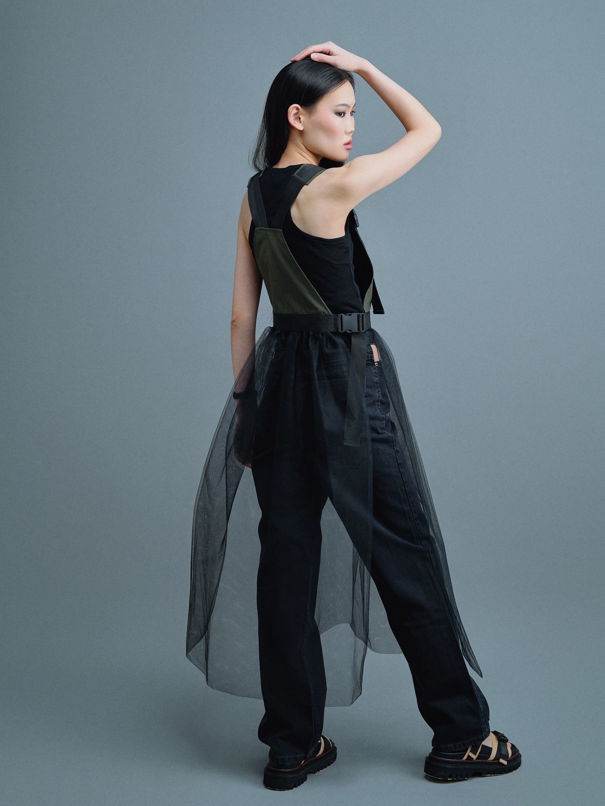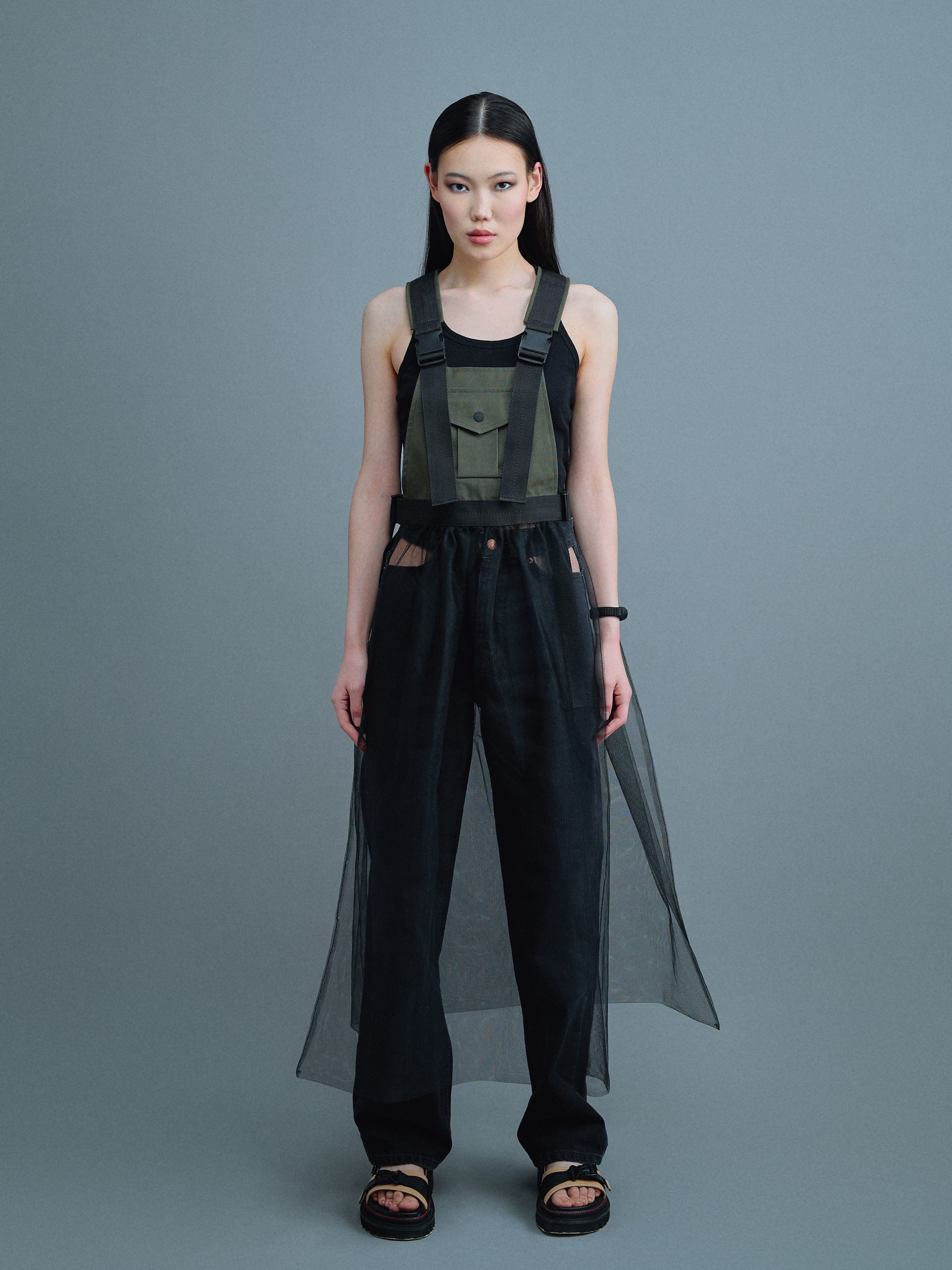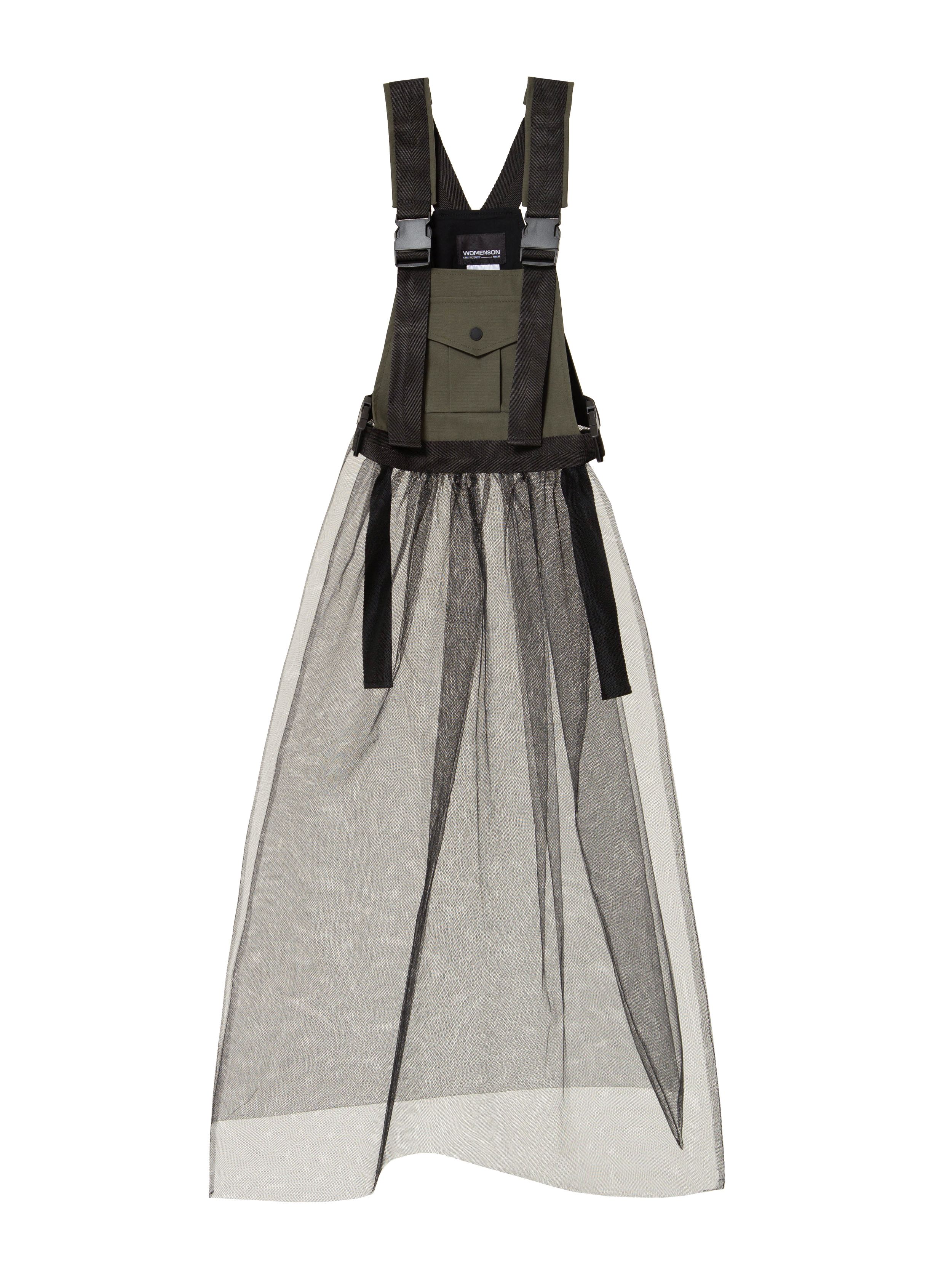 Фатиновая юбка с нагрудным карманом и регуляторами-фастексами — это арт-объект, визуально напоминающий сарафан. Сочетает в себе романтичность и женственность полупрозрачной сетки с функциональностью современных регуляторов и строп.