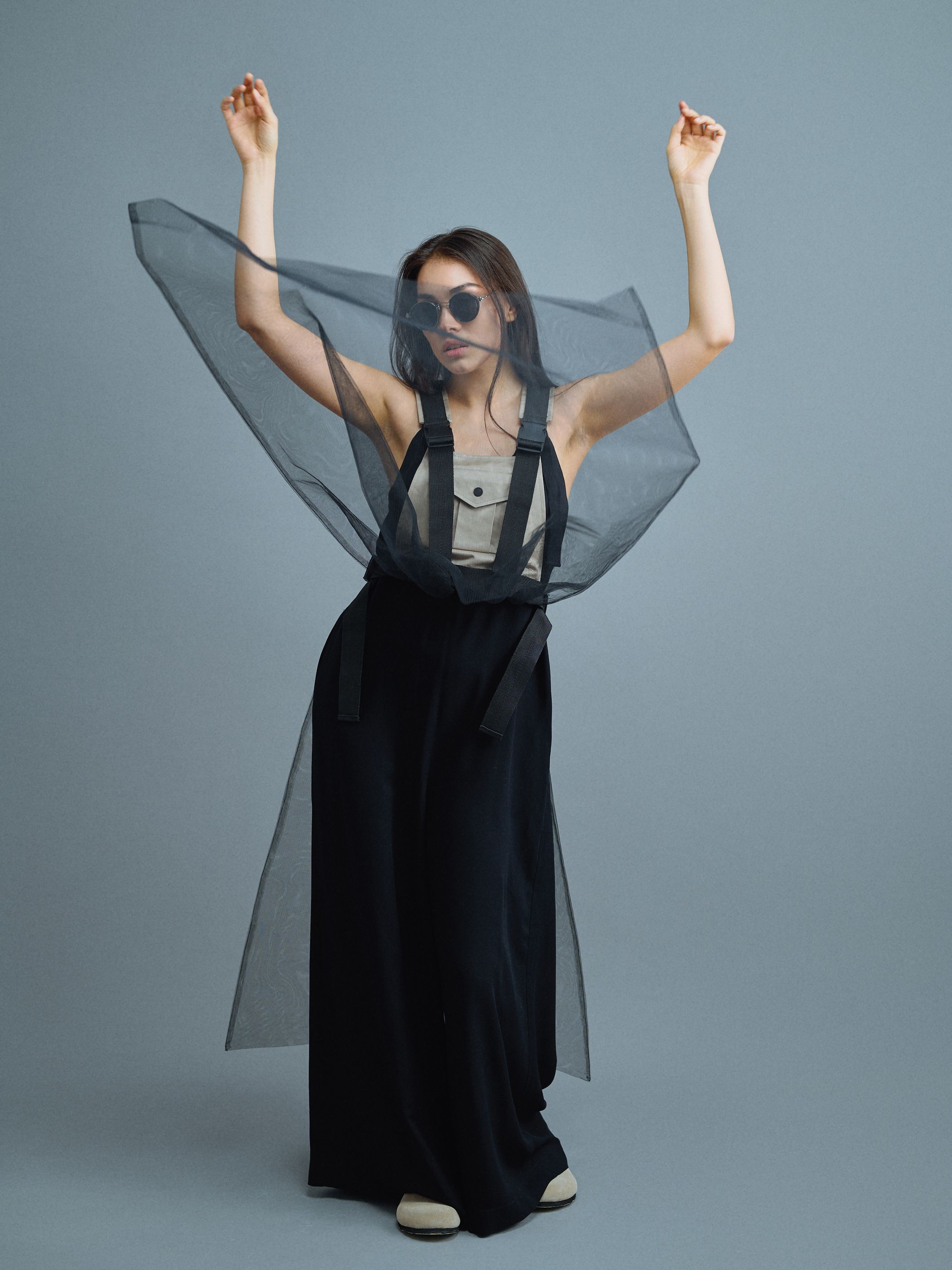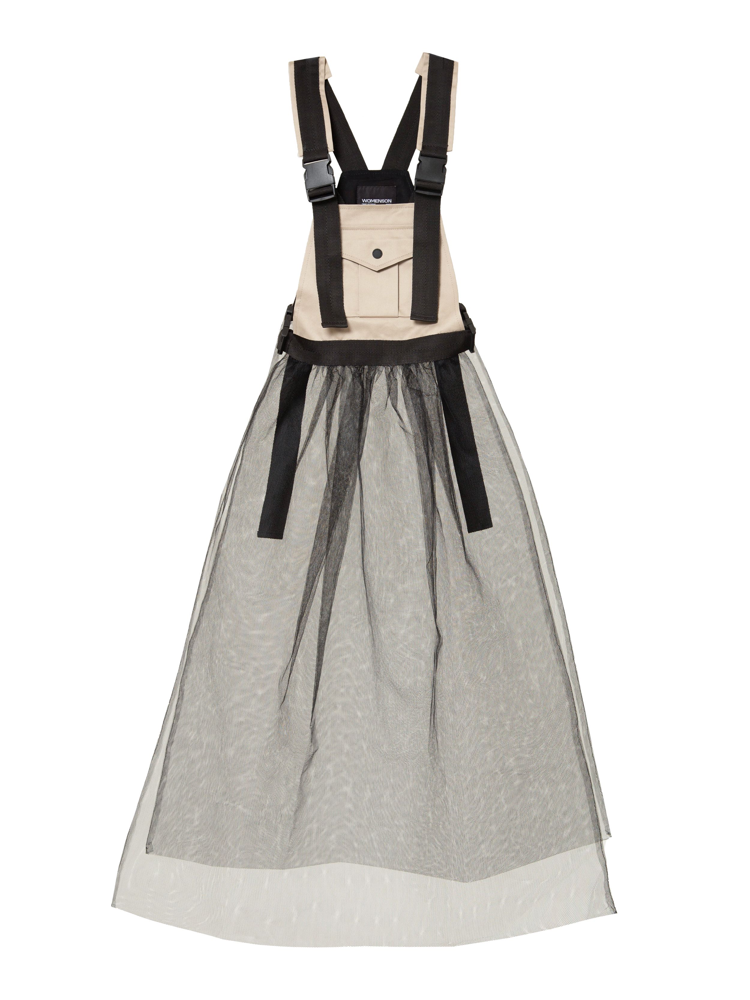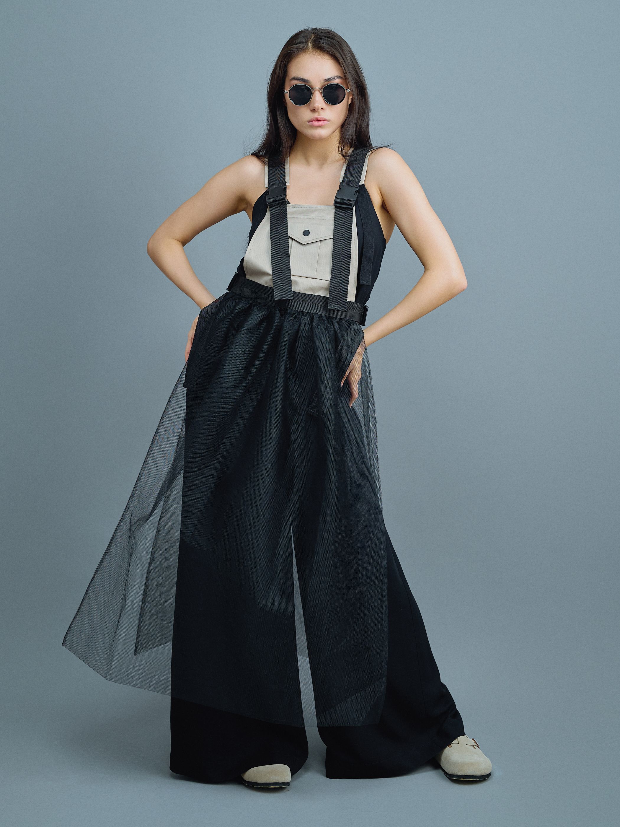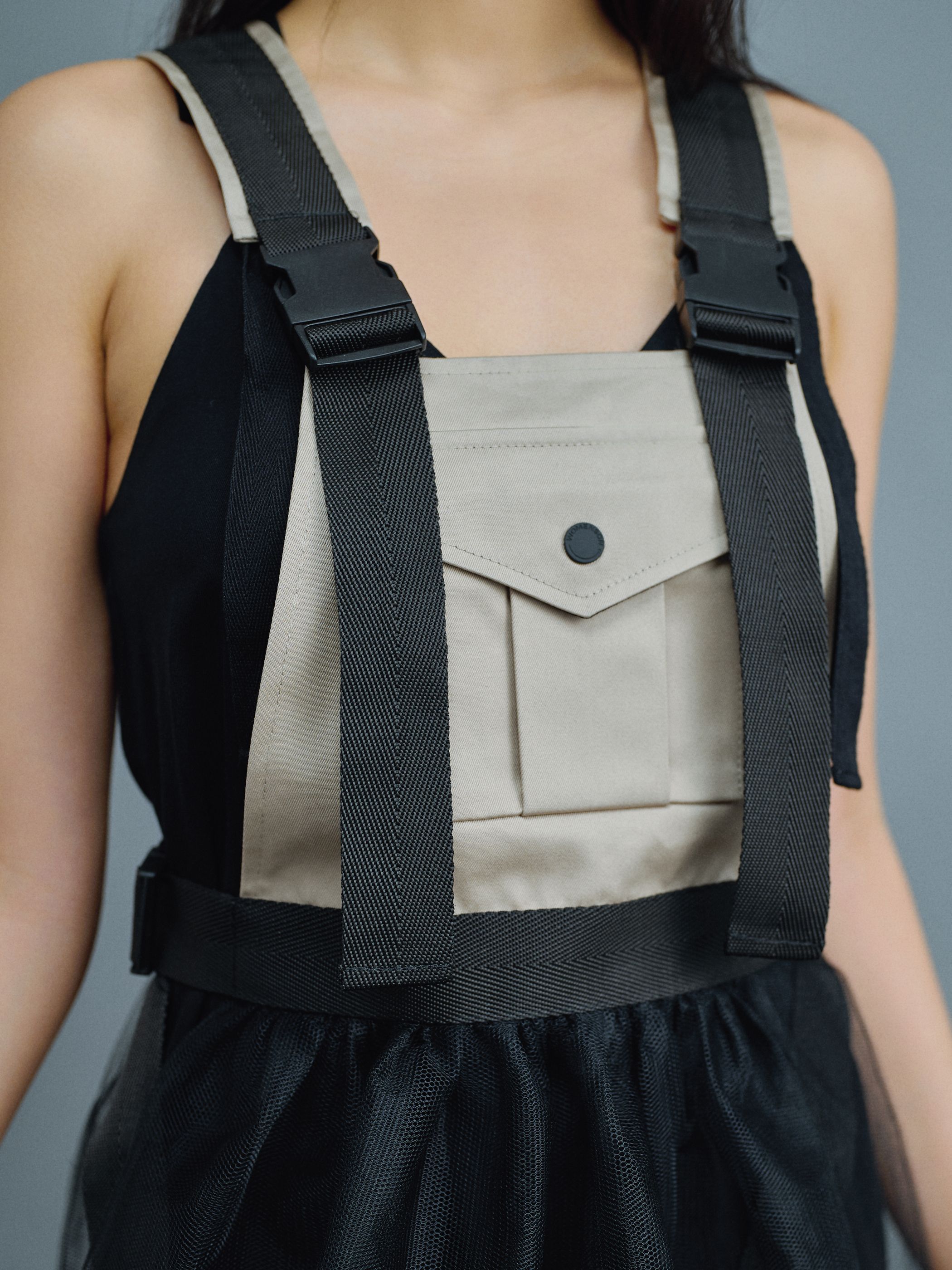 Фатиновая юбка с нагрудным карманом и регуляторами-фастексами — это арт-объект, визуально напоминающий сарафан. Сочетает в себе романтичность и женственность полупрозрачной сетки с функциональностью современных регуляторов и строп.