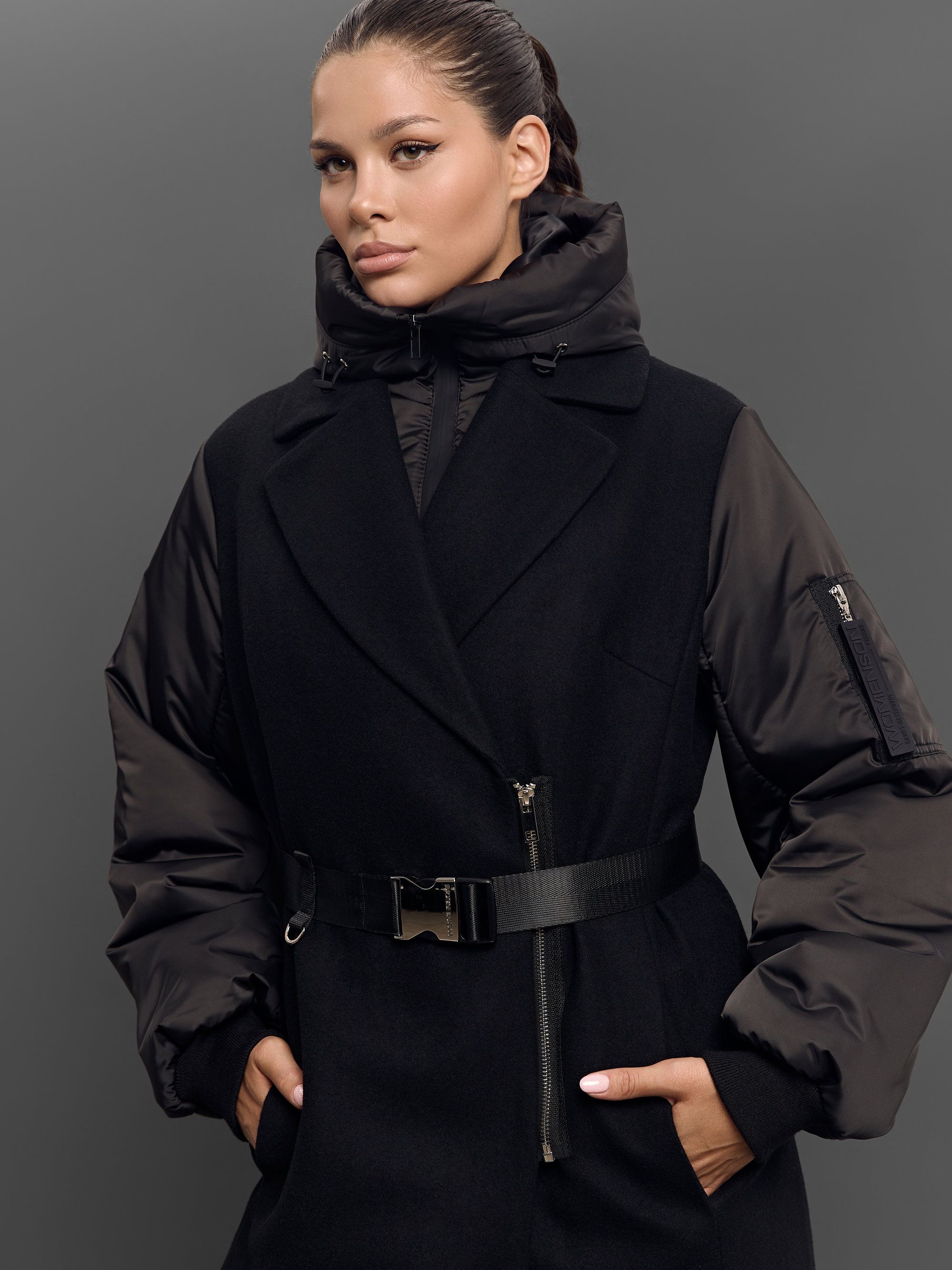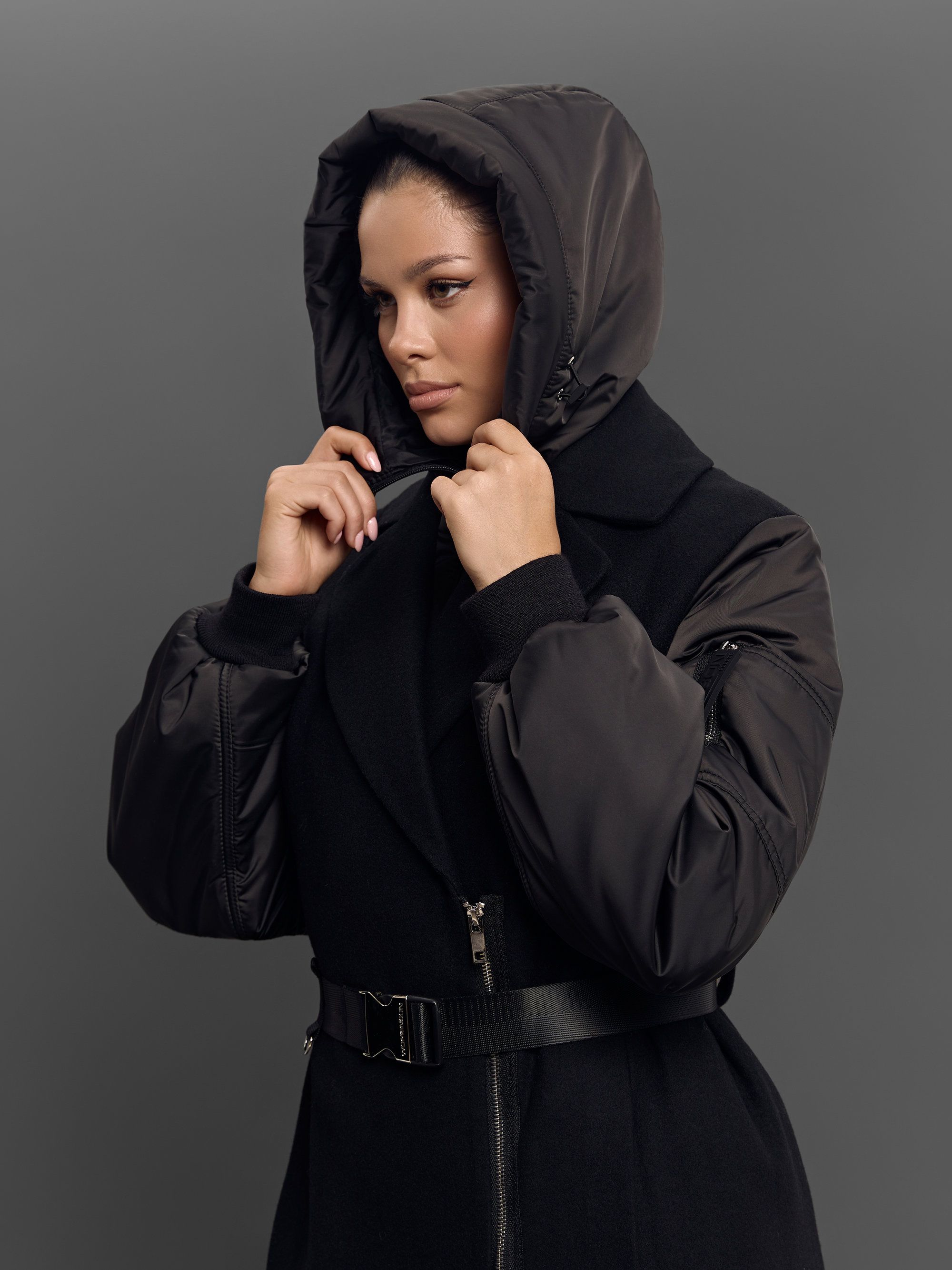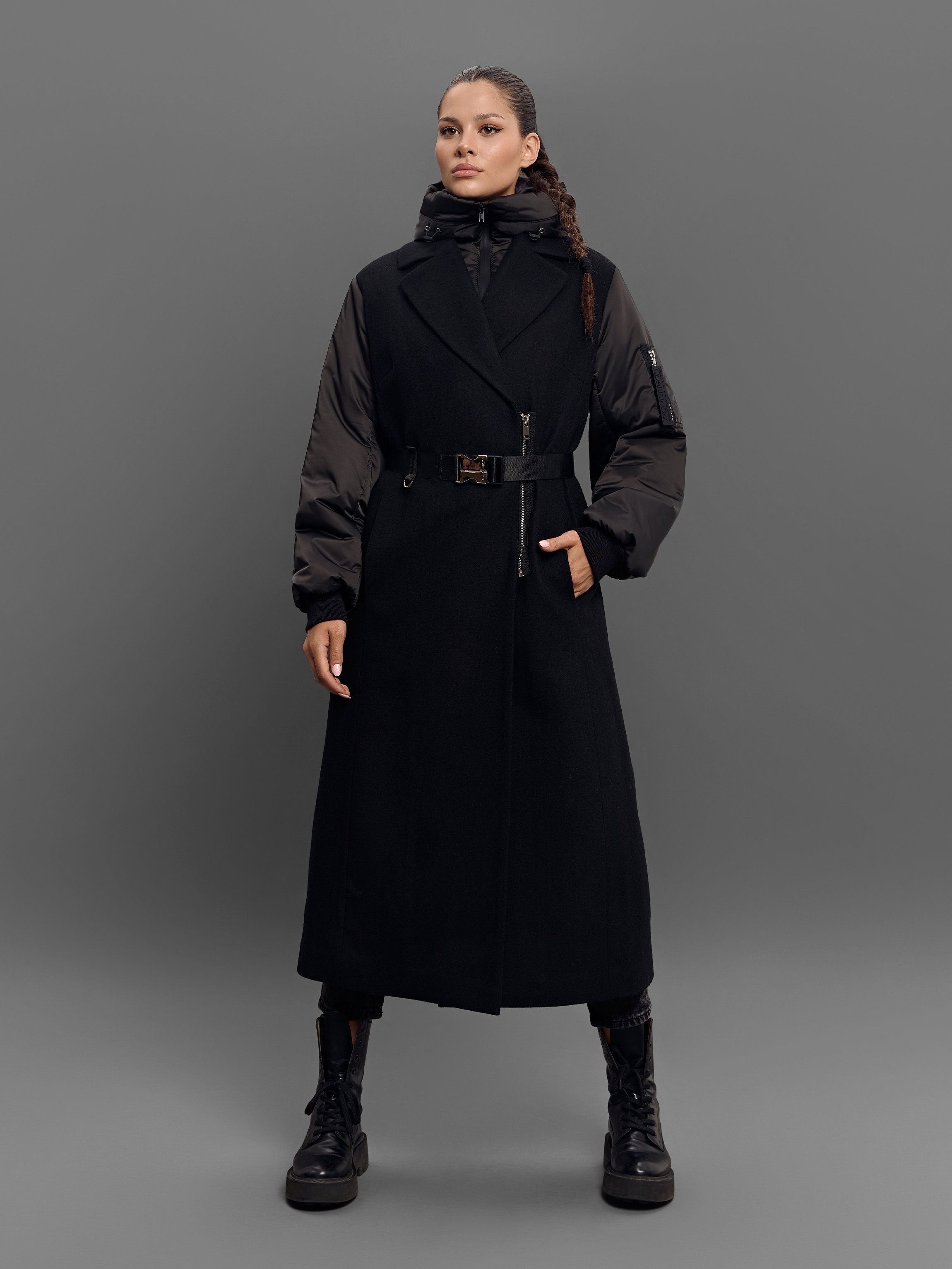 Утепленное шерстяное пальто осенне-зимнего сезона полуприлегающего силуэта длины макси. За счёт плотного сукна и технологичного утеплителя 150 г/м пальто выдержит морозную зиму. Съемная капюшон-манишка меняет функциональность изделия.
