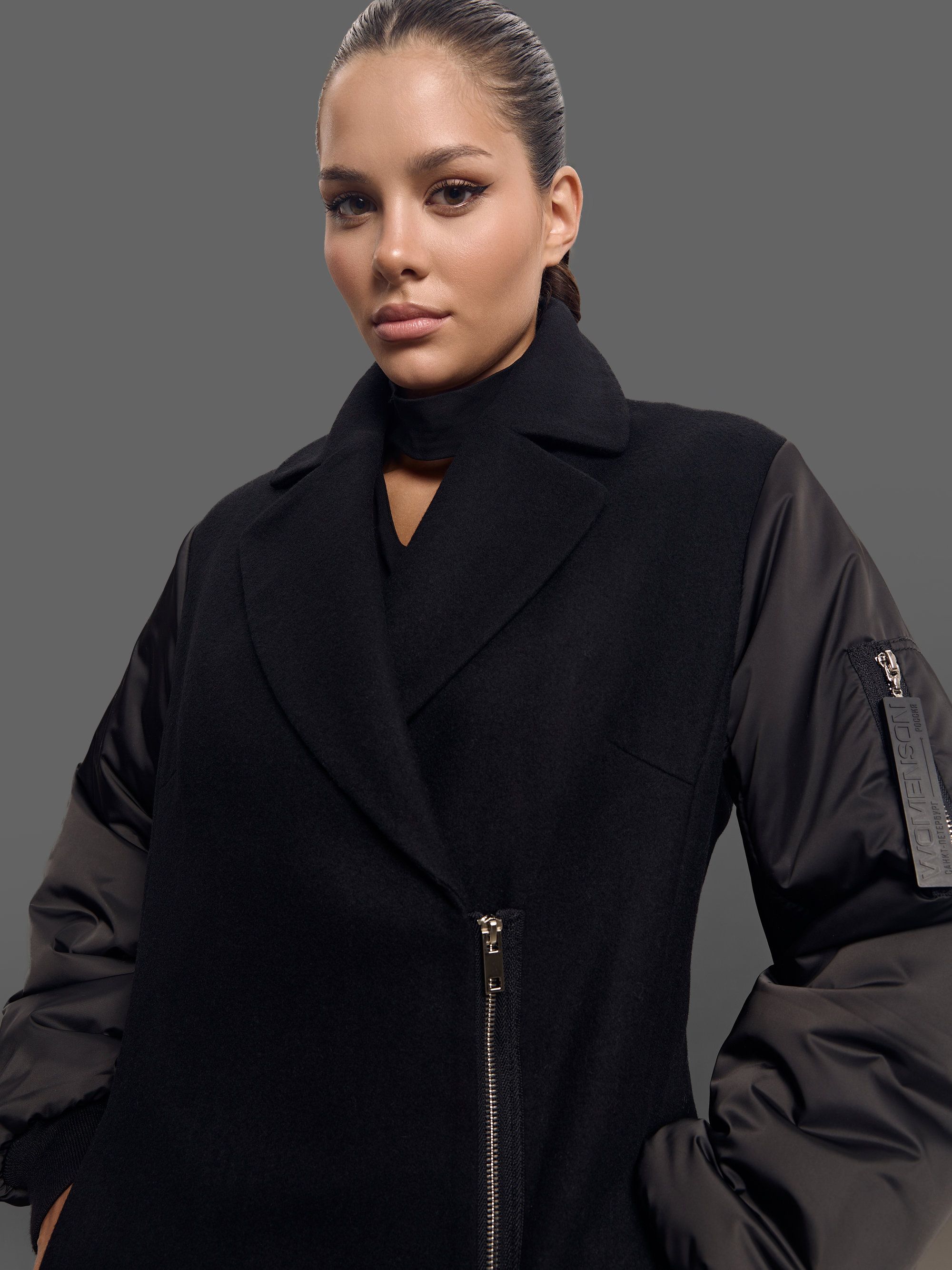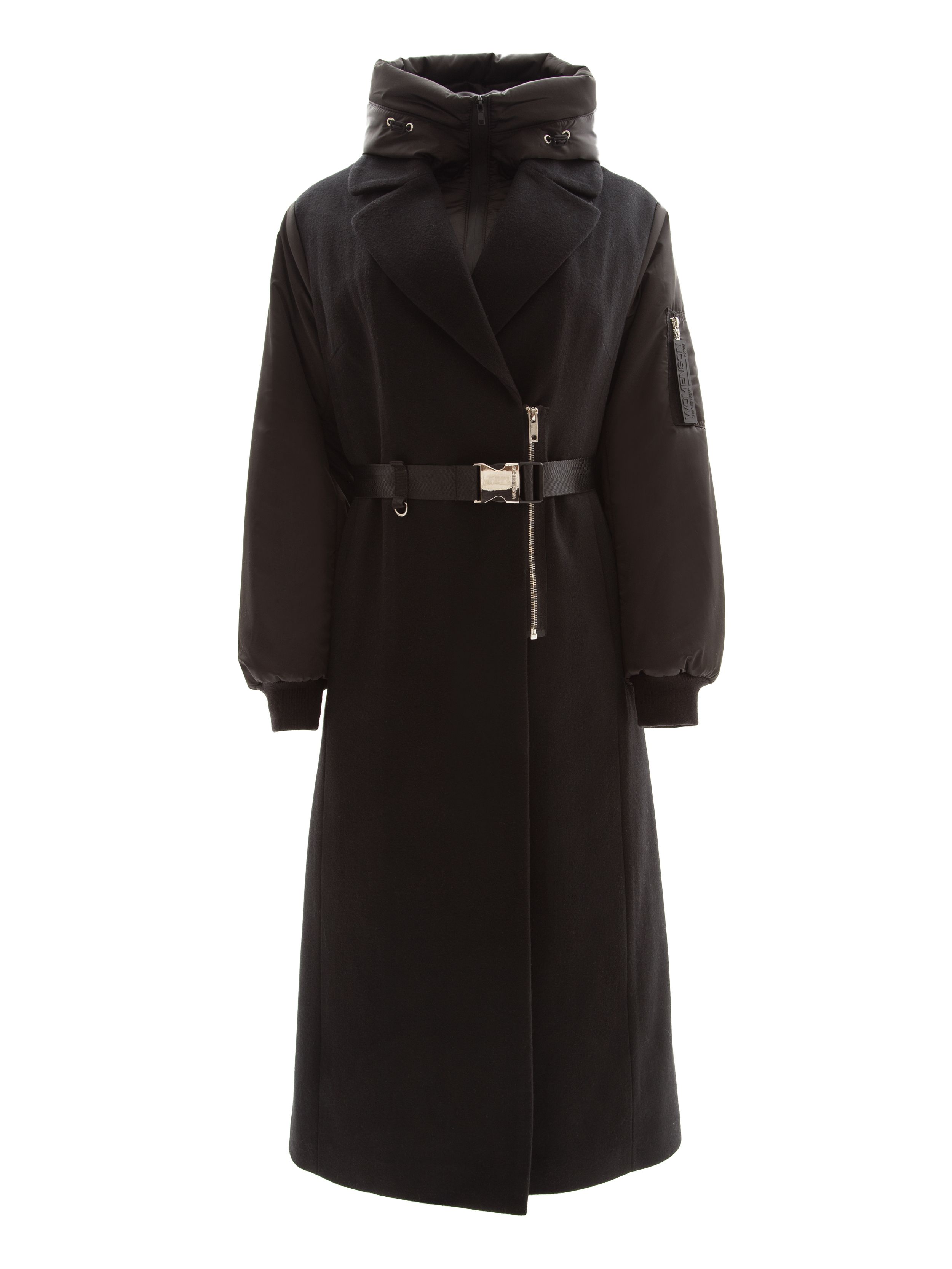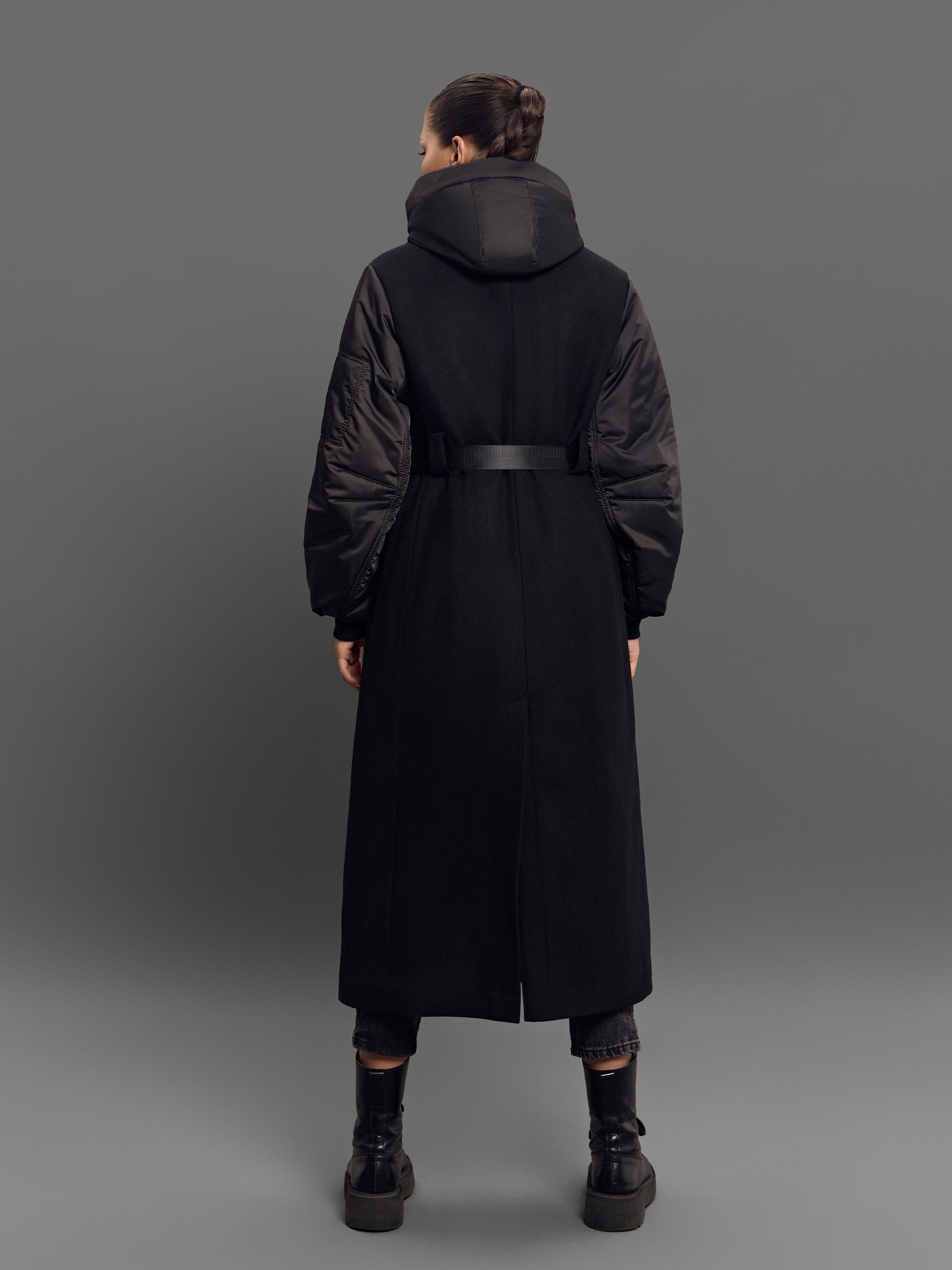 Утепленное шерстяное пальто осенне-зимнего сезона полуприлегающего силуэта длины макси. За счёт плотного сукна и технологичного утеплителя 150 г/м пальто выдержит морозную зиму. Съемная капюшон-манишка меняет функциональность изделия.